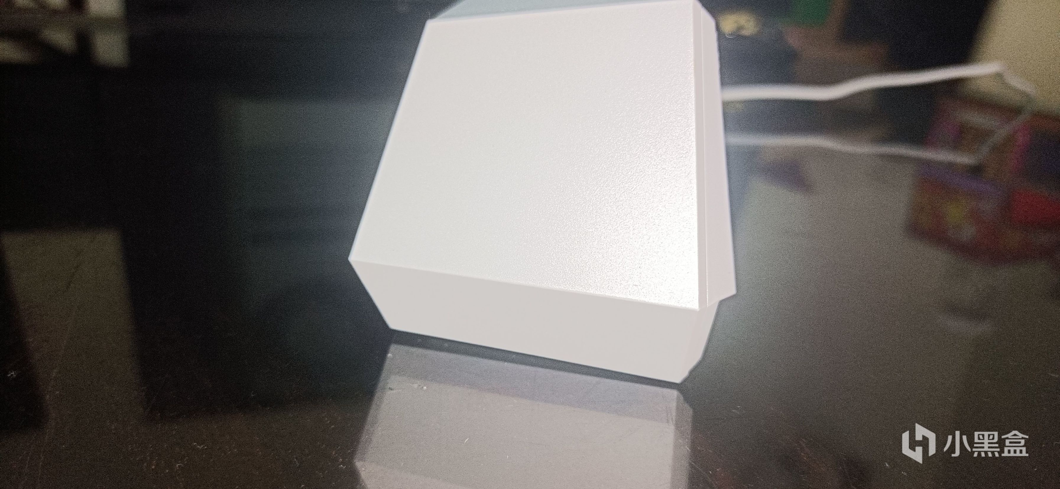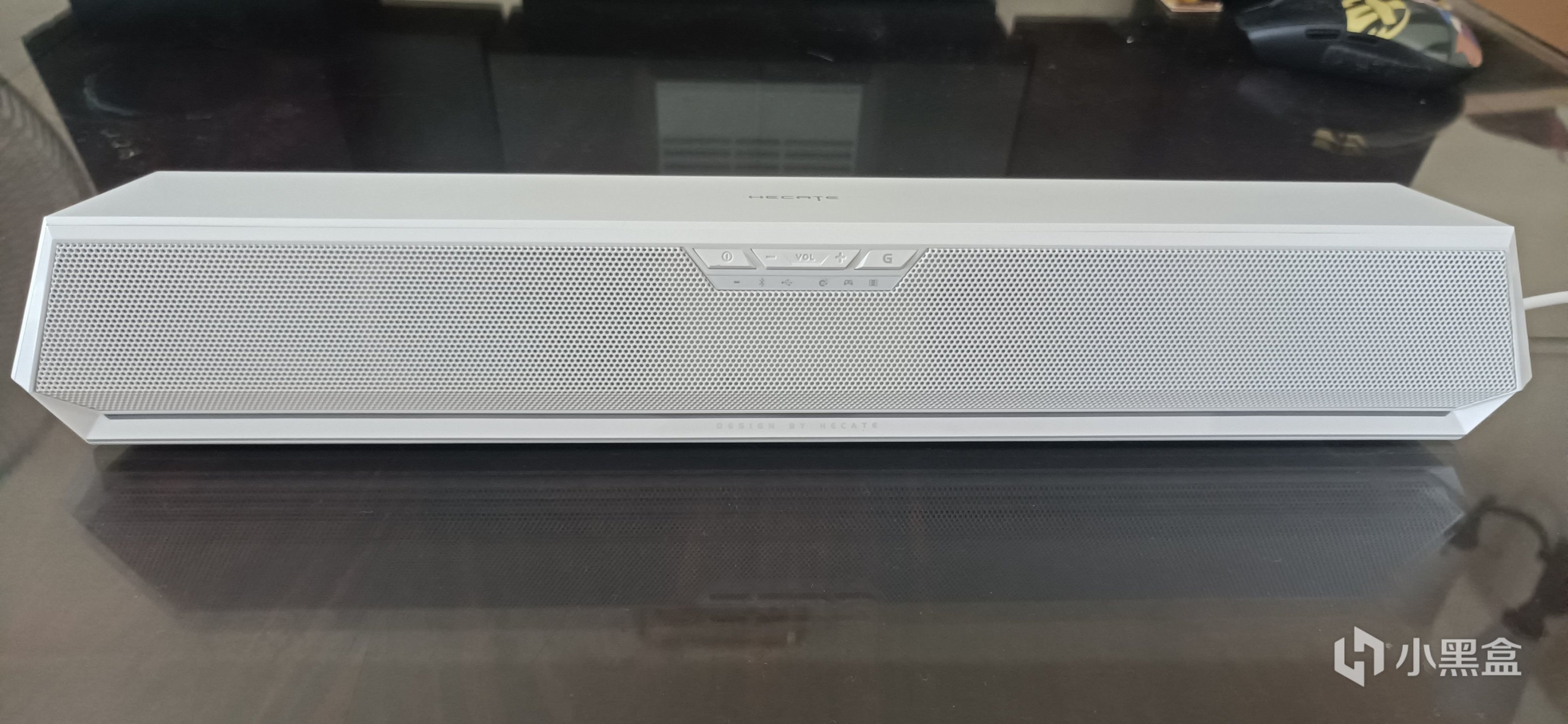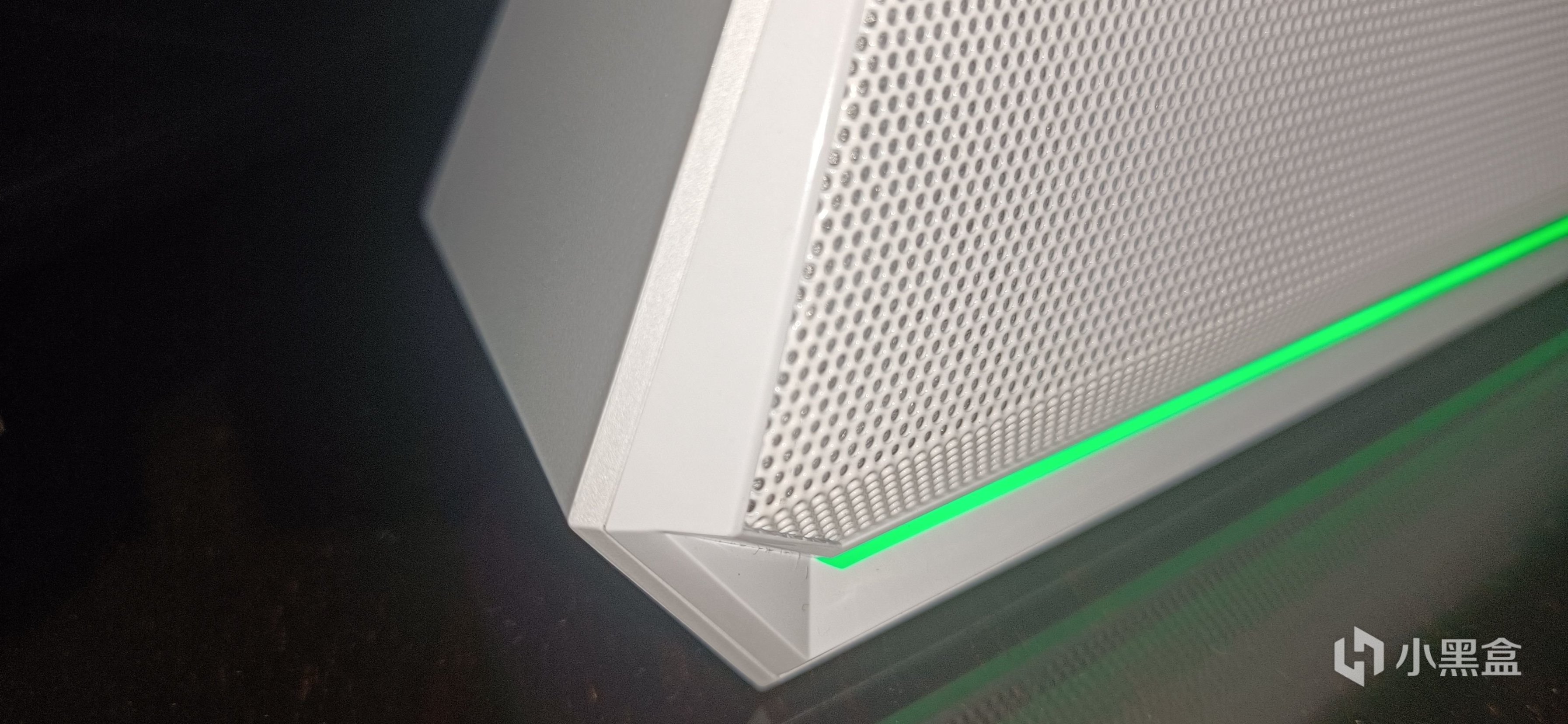音響雖然是塑料材料,但表面非常光滑,基本沒看到有什麼大縫隙,磨砂材質摸起來格外舒服。另外音響採用仰角的設計,角度略微向上彎曲,使音頻信號儘可能向上傳遞。