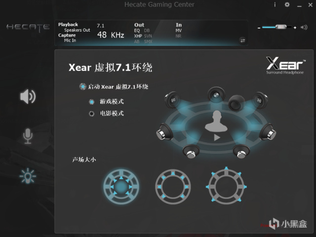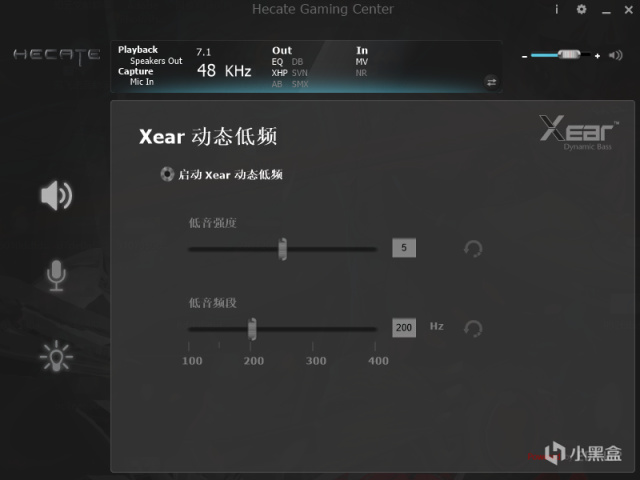 Hecate Gaming Center驅動軟件可以在官網下載,界面比較簡潔,分爲揚聲器、麥克風、燈光三個板塊,右擊揚聲器圖標可以選擇功能設置,有音量控制、取樣頻率、均衡器、Xear虛擬7.1環繞等、Xear音頻明亮化、Xear動態低頻、Xear智能音量、Xear環繞擴增共計8個功能。均衡器內置了Dance、Rap、Metal、Jazz等12種音效,也支持自定義。