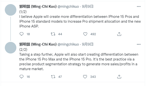 郭明錤表示,相信蘋果會在 iPhone 15 Pro 和 iPhone 15 標準機型之間創造更多差異化,以增加 Pro 出貨量分配和新 iPhone ASP。更進一步,蘋果還將開始在 iPhone 15 Pro Max 和 iPhone 15 Pro 之間創造差異化。這是通過精確的產品細分策略在成熟市場中產生更多銷售 / 利潤的最佳實踐。