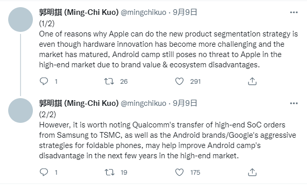 郭明錤表示,蘋果能夠做新產品細分策略的原因之一是,儘管硬件創新變得更具挑戰性,市場已經成熟,但由於品牌價值和生態系統的劣勢,Android 陣營在高端市場上仍然沒有對蘋果構成威脅。但值得注意的是,高通將高端 SoC 訂單從三星轉移到臺積電,以及 Android 品牌 / 谷歌對摺疊屏手機的激進策略,可能有助於改善 Android 陣營未來幾年在高端市場的劣勢。
