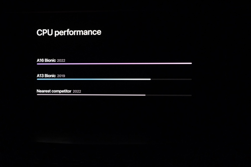據蘋果官方介紹,A16 仿生芯片由兩顆高性能核心和 4 顆高能效核心組成的 6 核中央處理器帶來的速度提升至高可達 40%(和 A13 相比),採用經加速的 5 核圖像處理器,內存帶寬提升多達 50%,極爲適合運行圖形密集型遊戲和 App,而全新 16 核神經網絡引擎的處理能力高達每秒 17 萬億次運算,這枚芯片可在耗電量極低的情況下提供更高的性能,從而實現全天候電池續航。