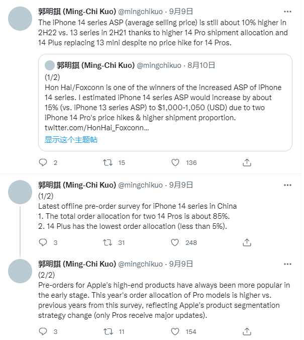 郭明錤表示,iPhone 14 系列 ASP(平均售價)在 2H22 與 2H21 的 iPhone 13 系列相比仍然高出約 10%,這要歸功於更高的 iPhone 14 Pro 出貨分配和 iPhone 14 Plus 取代了 iPhone 13 mini,儘管 iPhone 14 Pro 的價格沒有上漲。