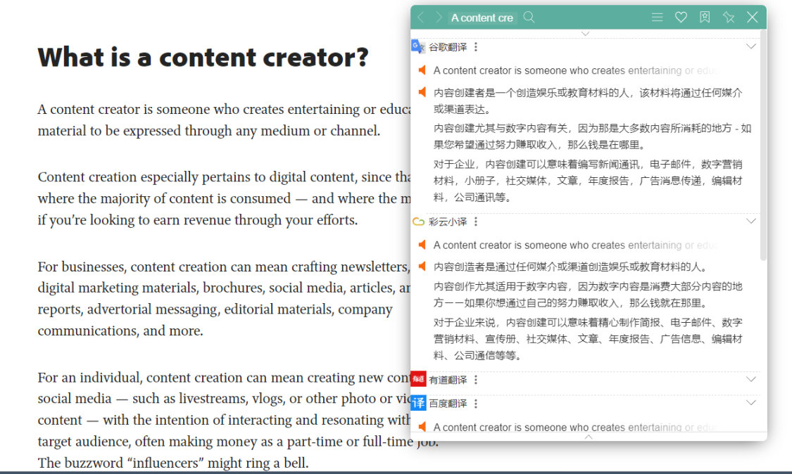 聚合型劃詞翻譯,一鍵調用多個翻譯的結果,谷歌,彩雲,百度,騰訊,有道等等。