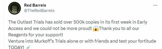 開發商Red Barrels宣佈,19日發售的《逃生 試煉》搶先體驗雙平臺(Steam/Epic)首周銷量突破50萬份。