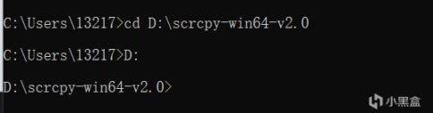 6.複製下載的文件路徑,我的是D:\scrcpy-win64-v2.0。在命令行輸入cd D:\scrcpy-win64-v2.0