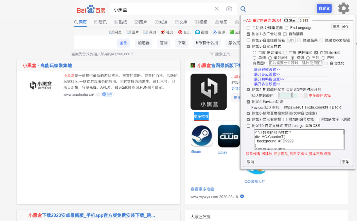 可以方便的在各个搜索引擎之间跳转,增加可视化设置菜单,举个例子,用谷歌搜索小黑盒,可以在脚本新增的一条工具栏中快速切换到别的搜索引擎如百度,Bing等等,可以自定义网址和搜索引擎。