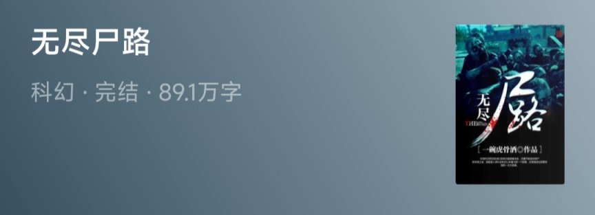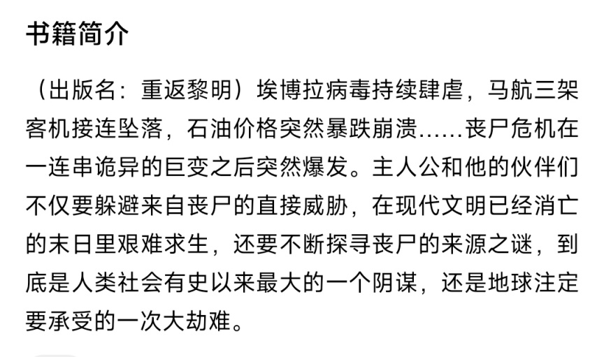 个人看法:非常不错的末世类小说,展现了现代文明崩溃的过程,剧情叙事和细节表达一度让人怀疑作者就是从末世穿越过来的,大力推荐