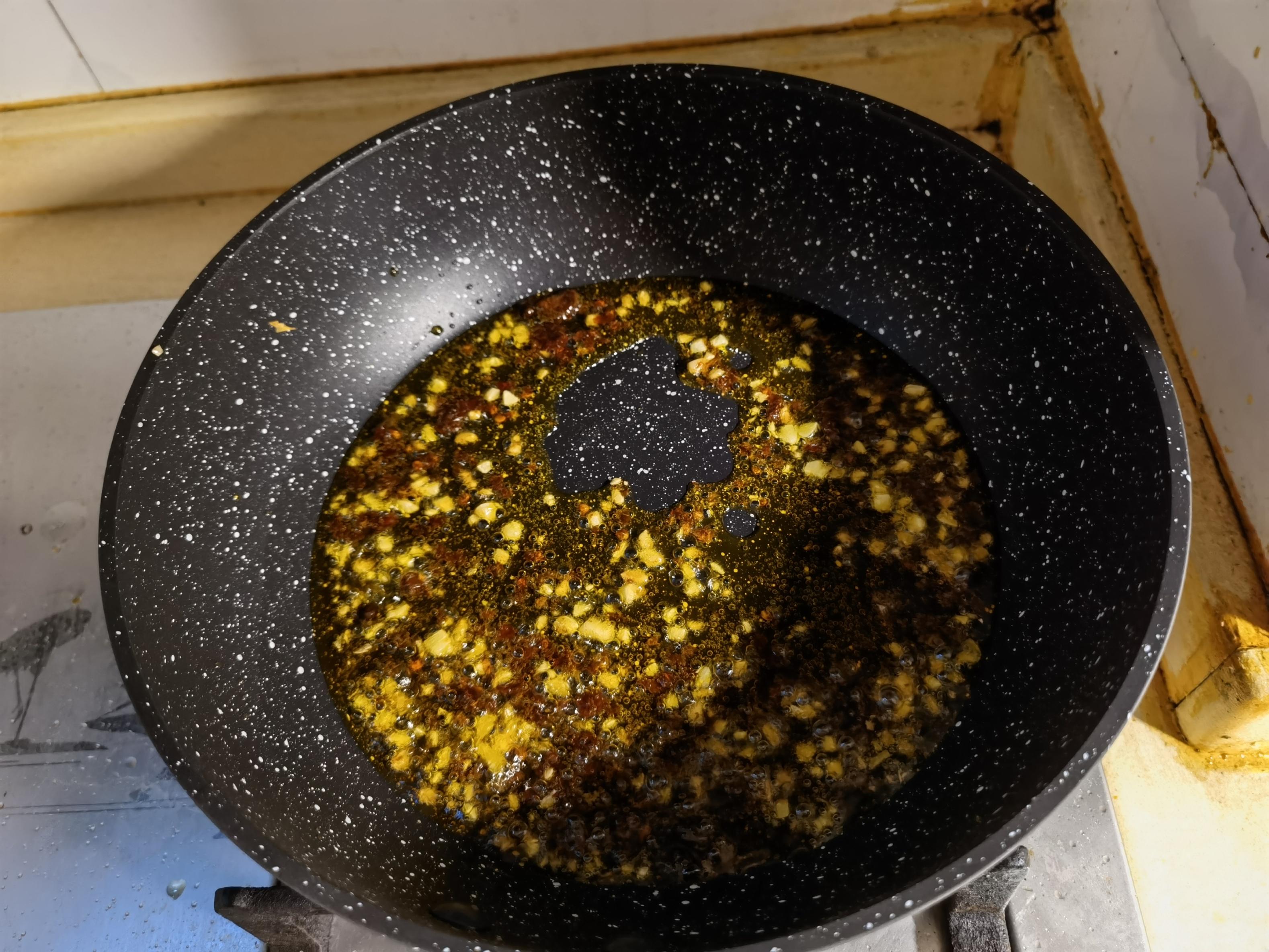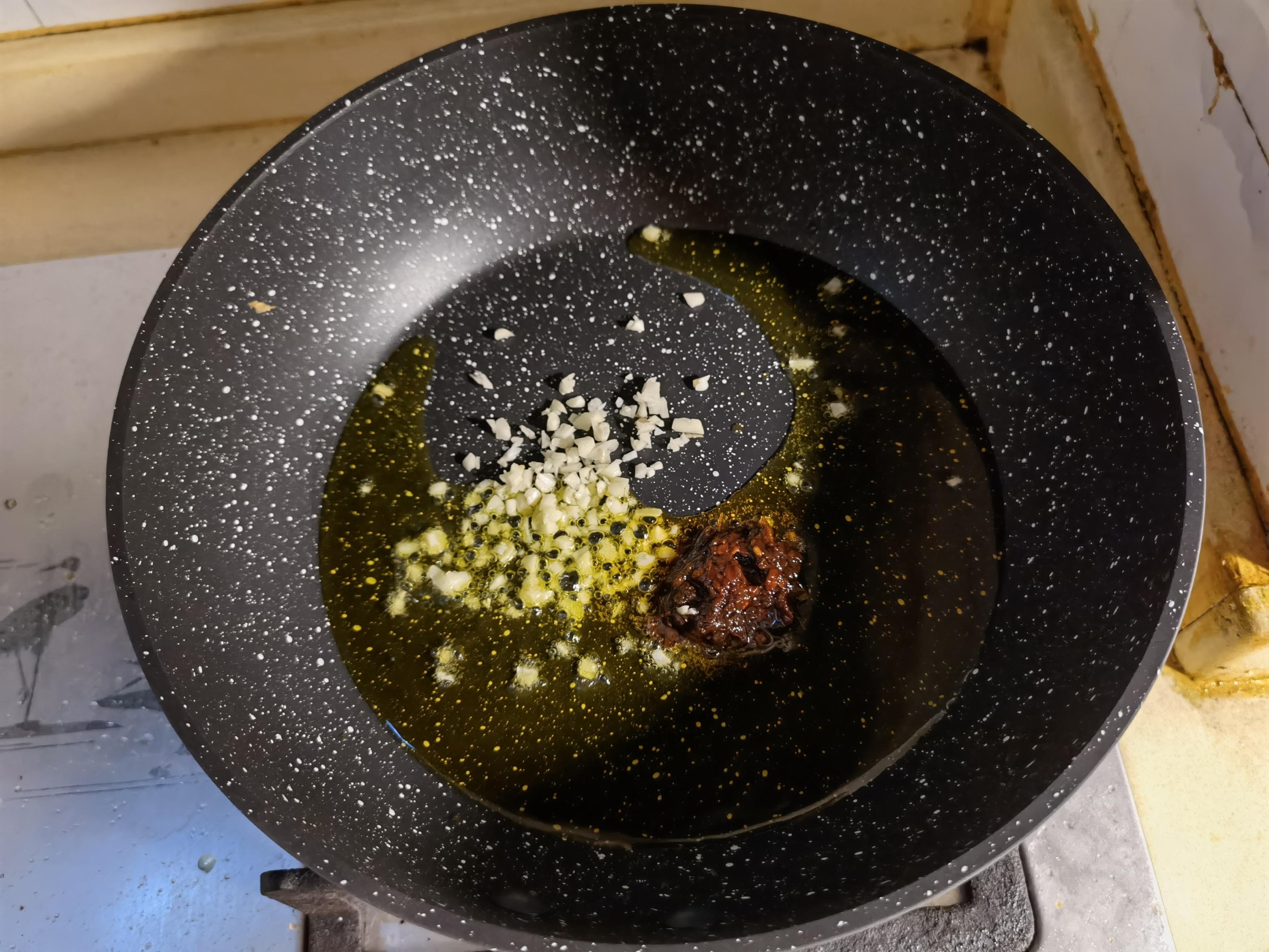 下入适量食用油,中小火热油,热油至四成热,下入蒜末和豆瓣酱,炒香,大约20s;
