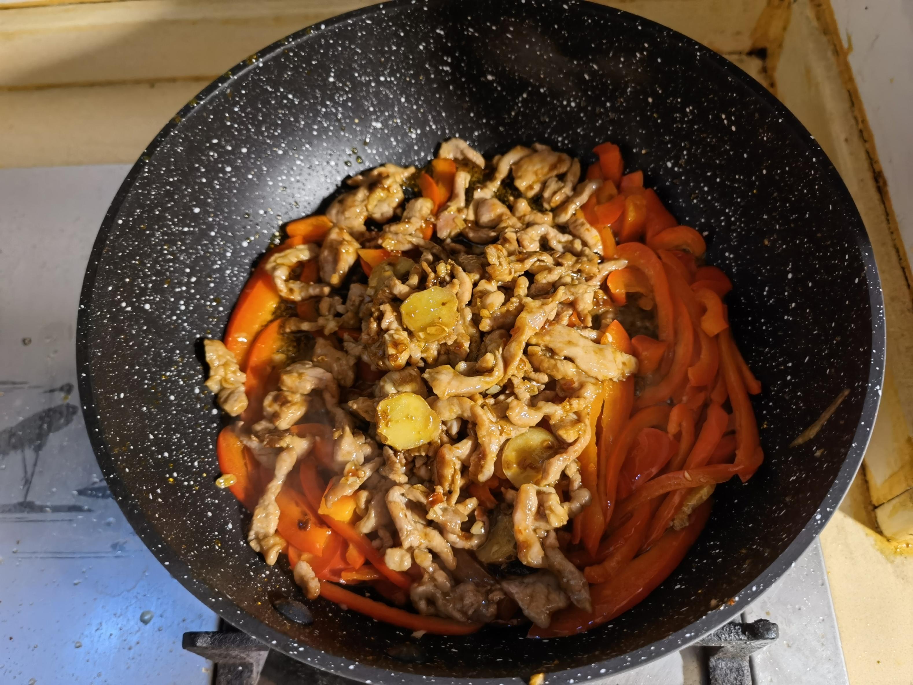 再向锅中倒入一点底油,等油温升至四五成热,下入甜椒丝中大火翻炒至断生,