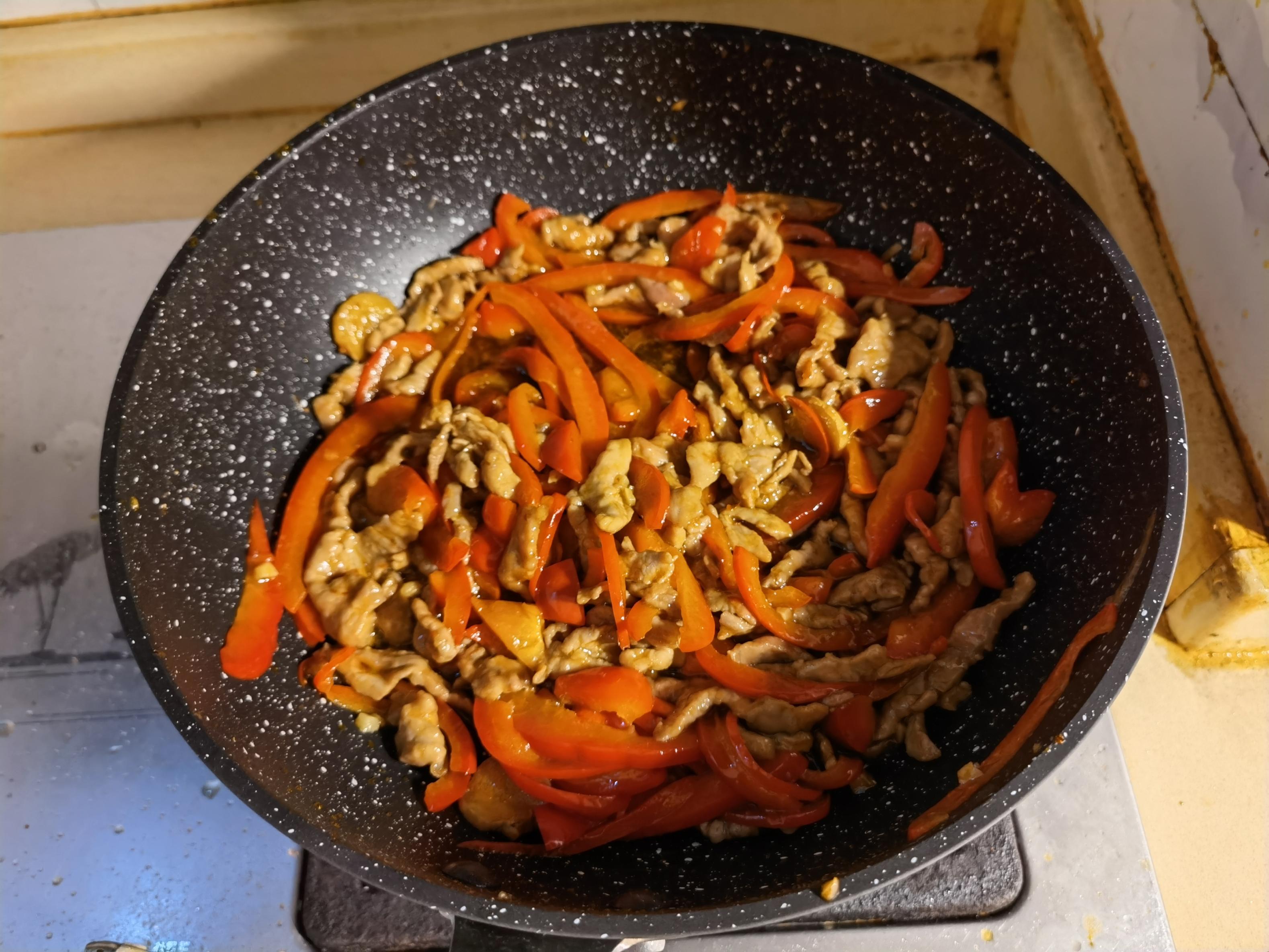 因为甜椒炒熟了之后本身就有甜味,因此没有加什么调料炒,如果希望甜椒味道更丰富的话,可以将蒜末和豆瓣酱于炒甜椒丝步骤前下入。