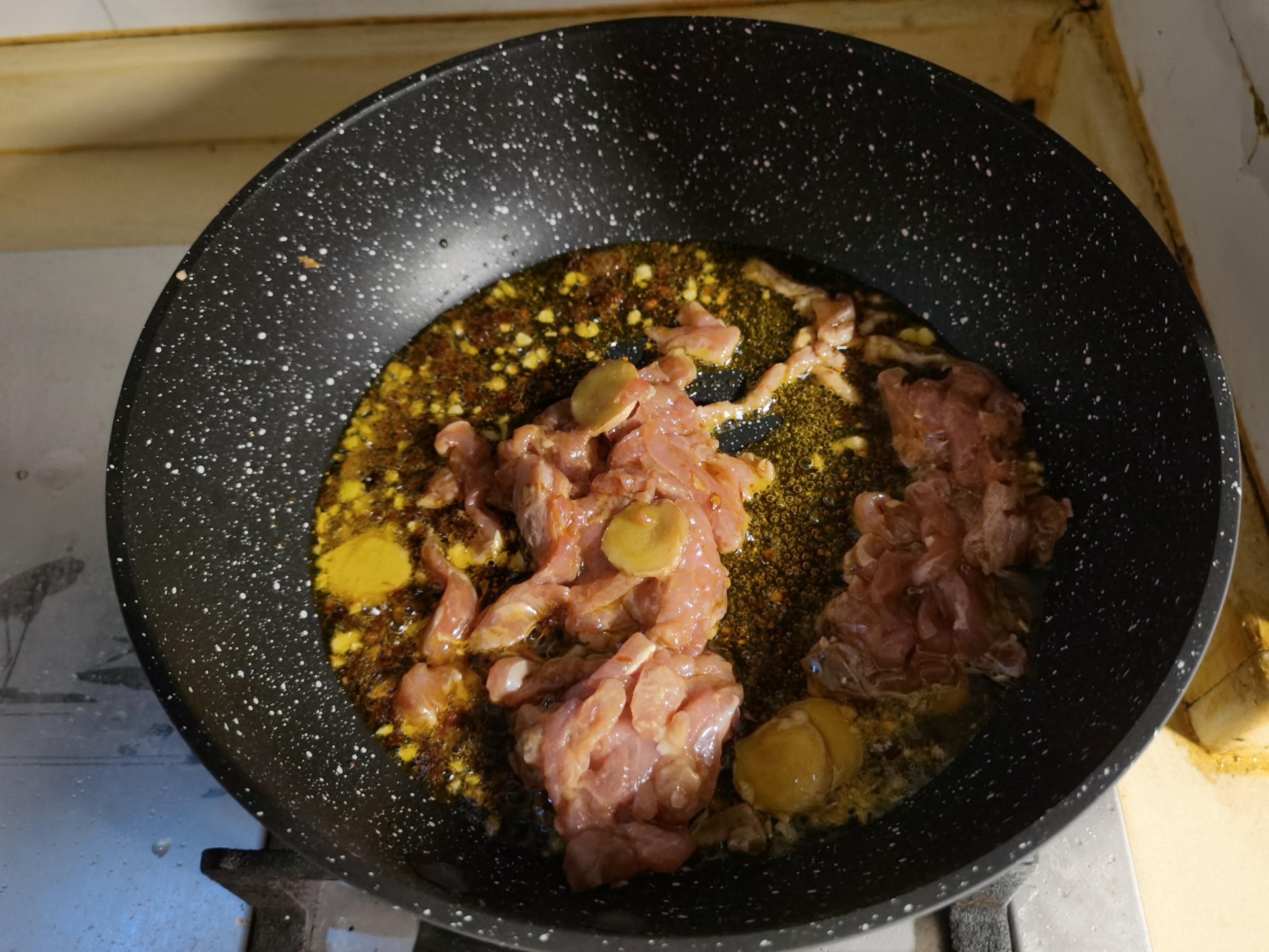 等油温约六成热,下入腌制好的肉丝迅速滑散,炒至肉丝没有血色为止(可以将姜片挑出),先倒出肉丝,