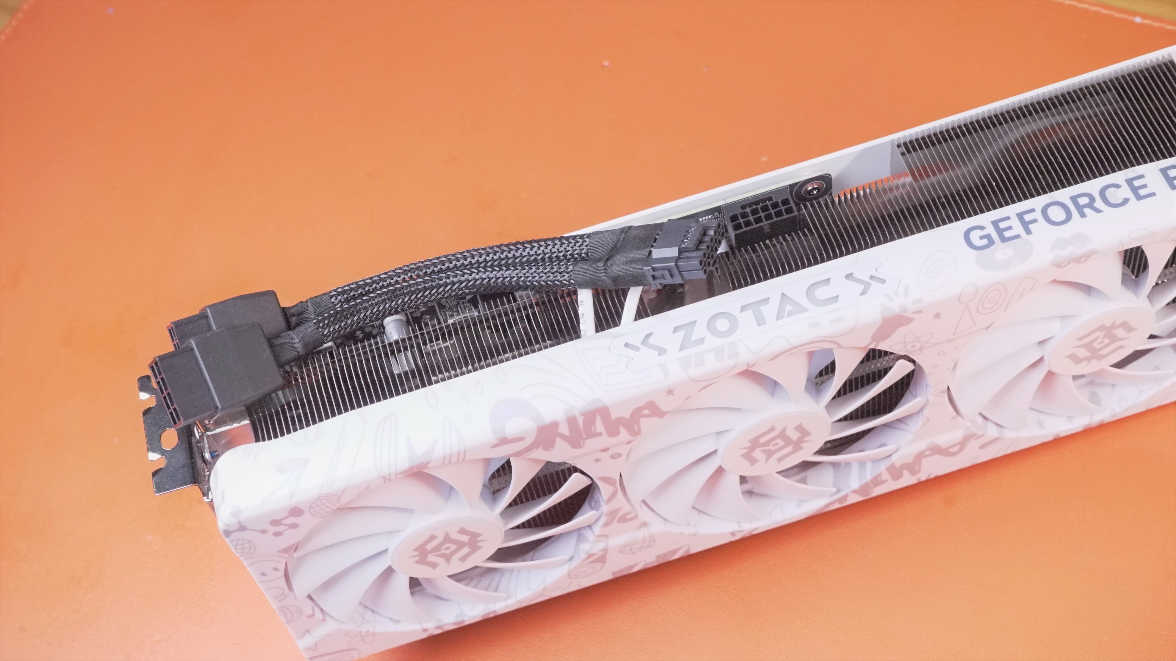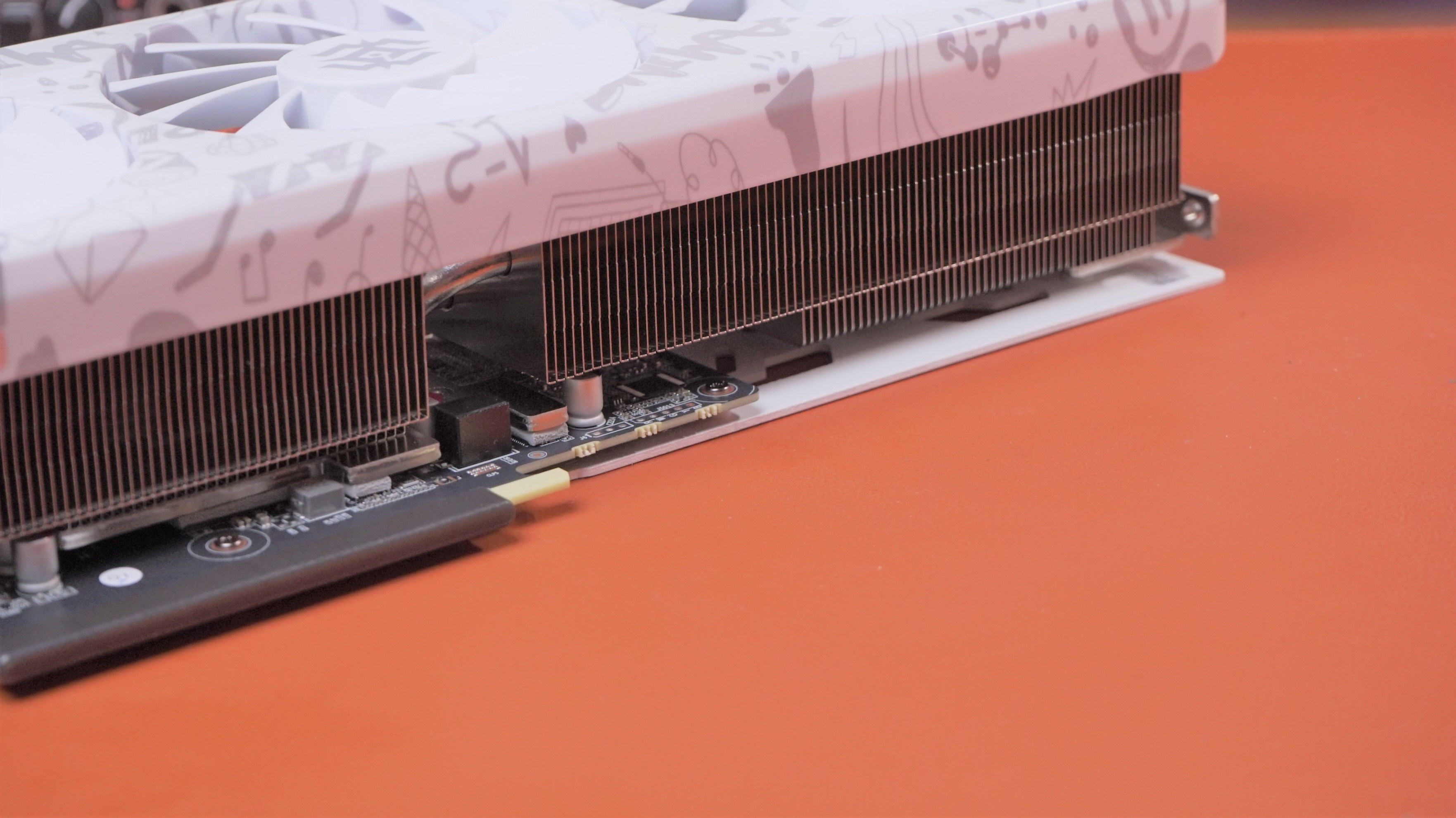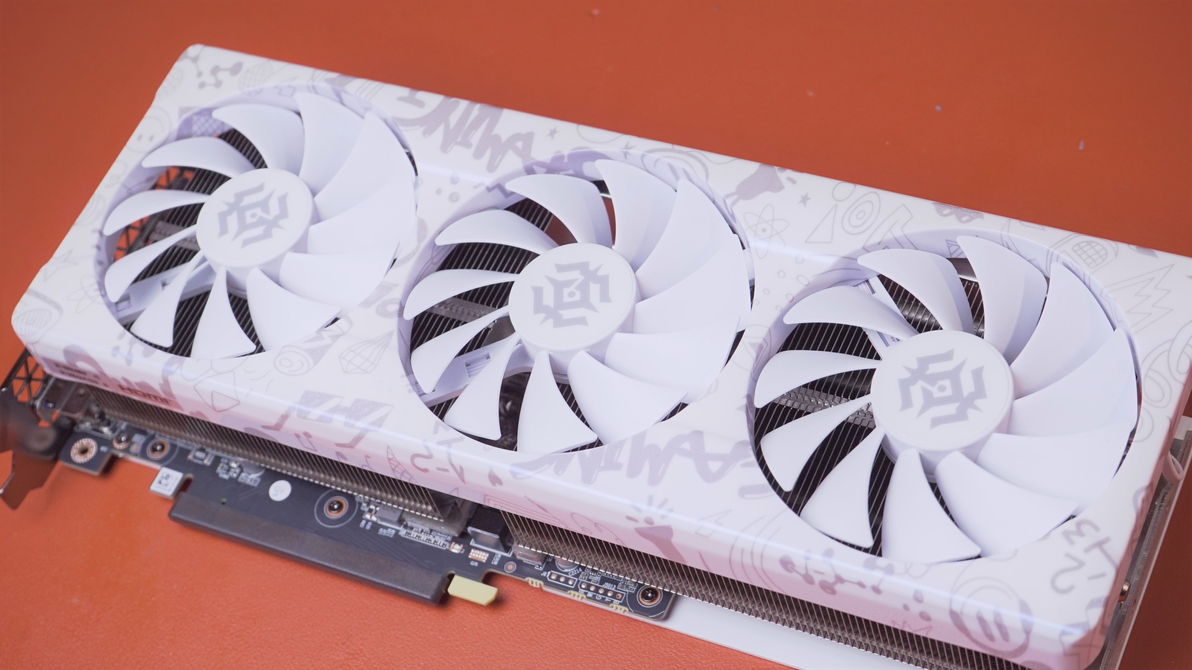 RTX 4070 X-GAMING OC 在正面采用了欧泊白主色设计,在不同角度看过去还会变色,在正面也有很多涂鸦的图案,让整张显卡看上去非常的年轻。