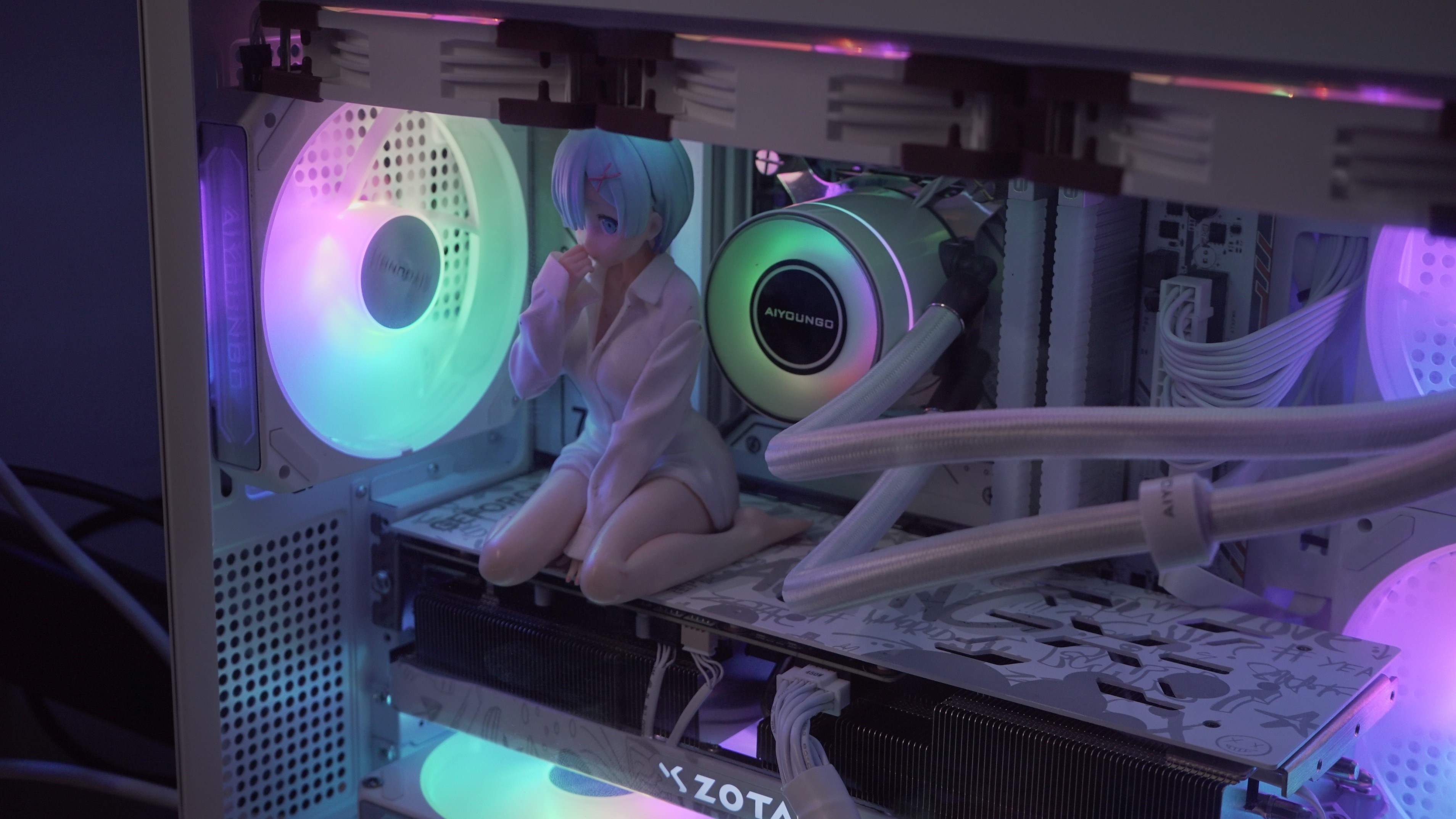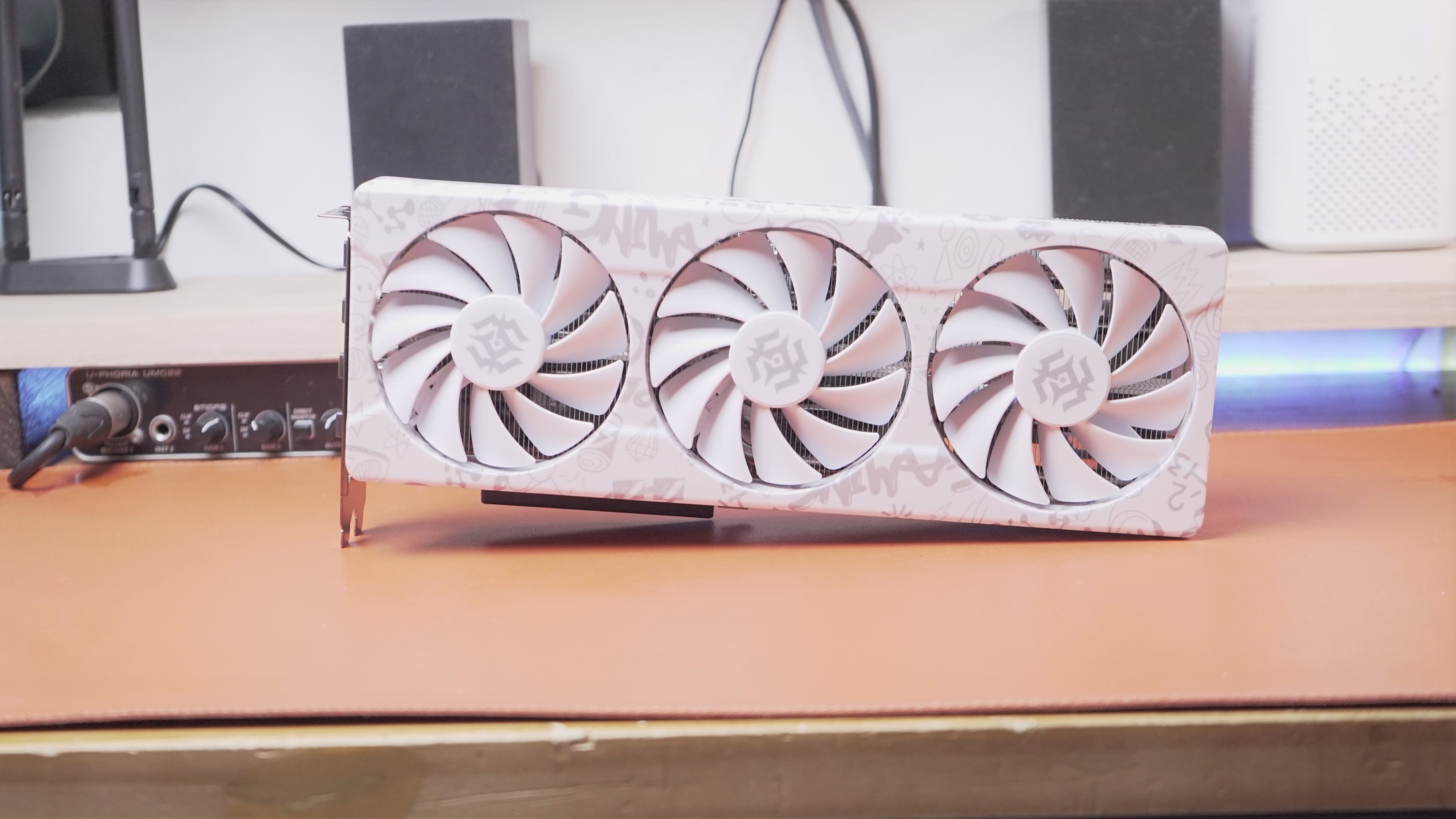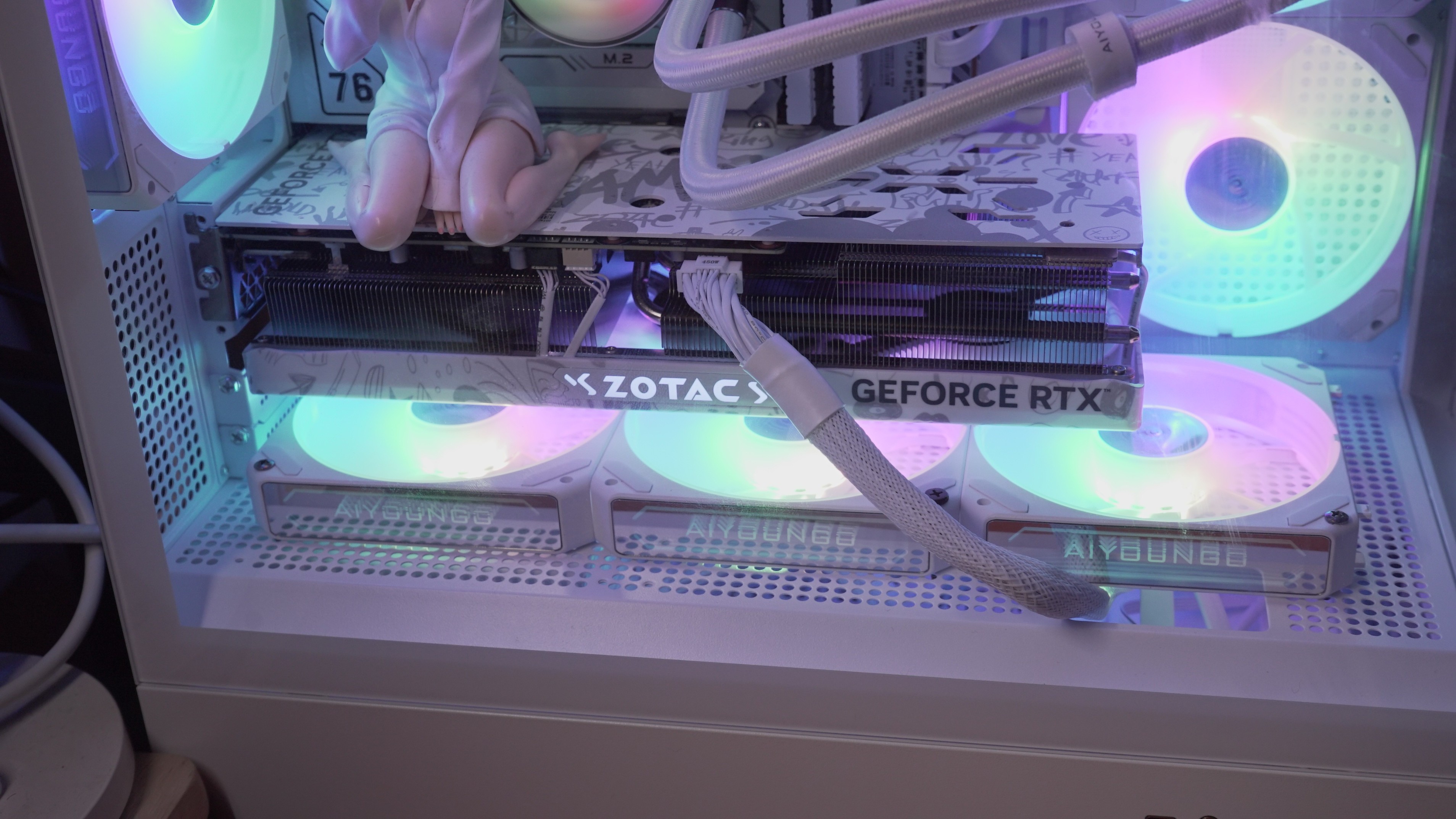RTX 4070 X-GAMING OC 在正面采用了欧泊白主色设计,在不同角度看过去还会变色,在正面也有很多涂鸦的图案,让整张显卡看上去非常的年轻。