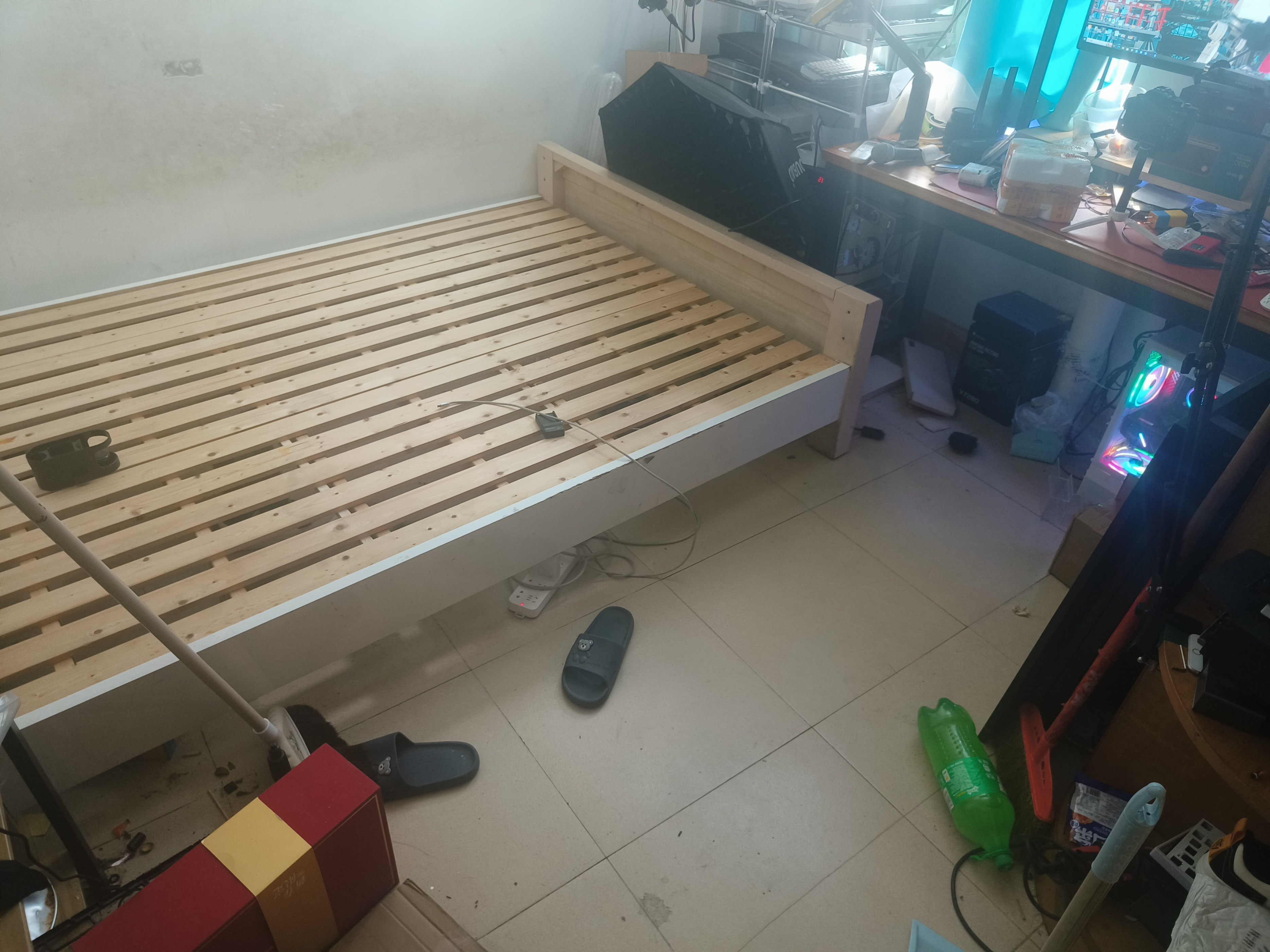 我买的这个呢是1.2m×2m的,刚好就够我睡觉用了,底部离地面呢也有170CM的高度,所以就直接多岀了一大块的空间供你使用,多出来的平面空间呢,你就可以根据自己的需求来布置,我在这边就搭了一个拍摄产品的小场景!(拿个4070显卡客串下)