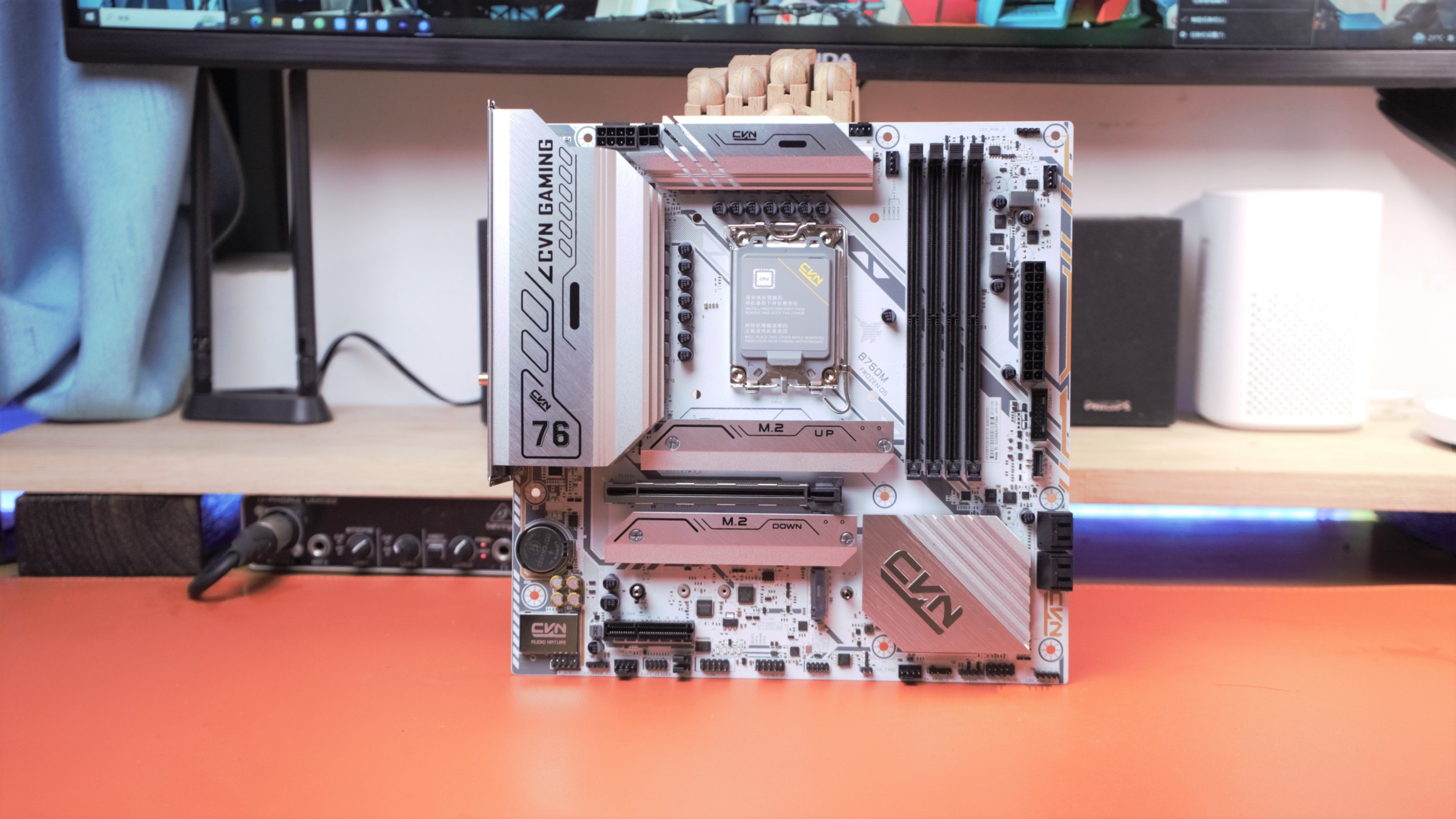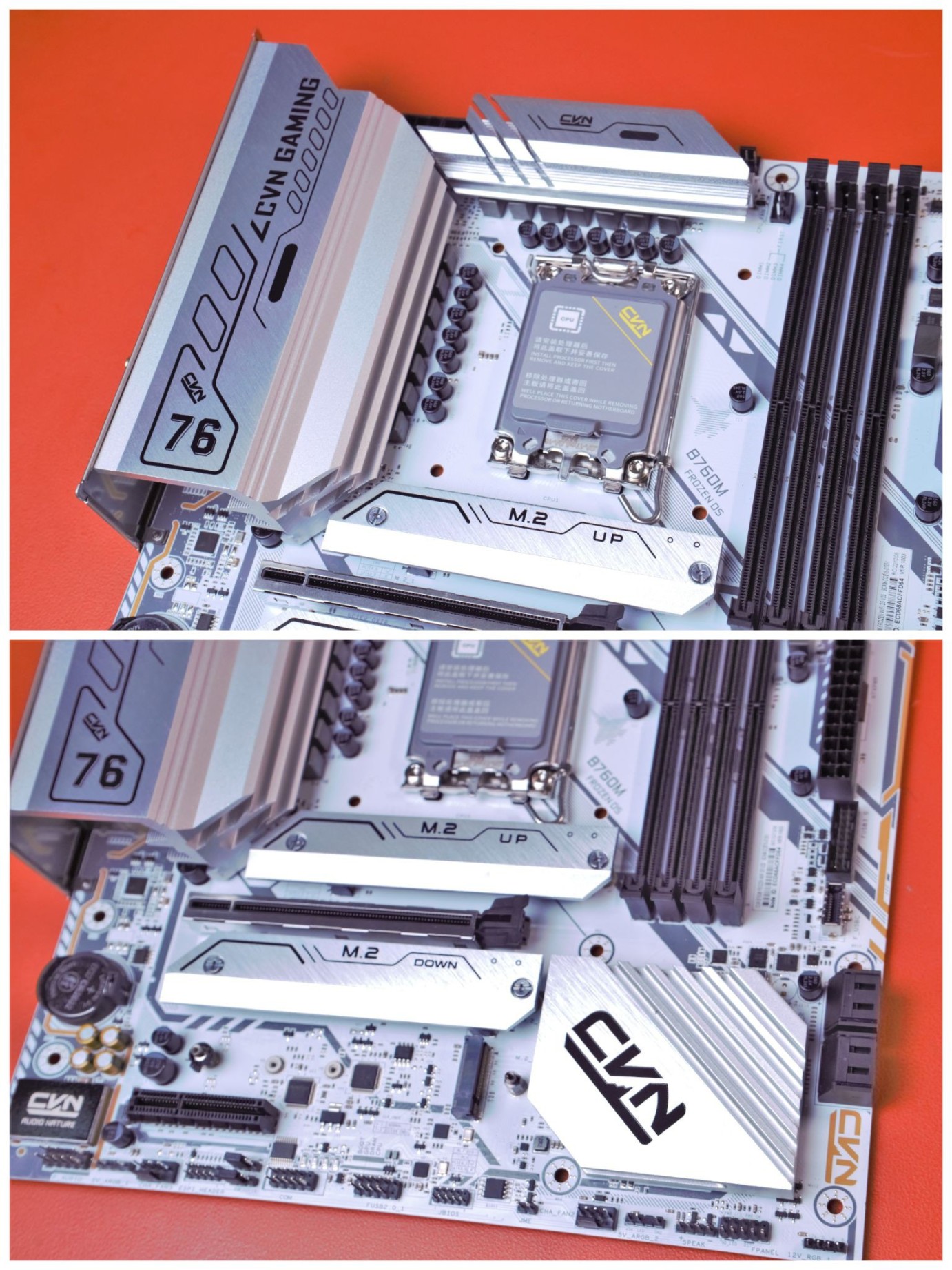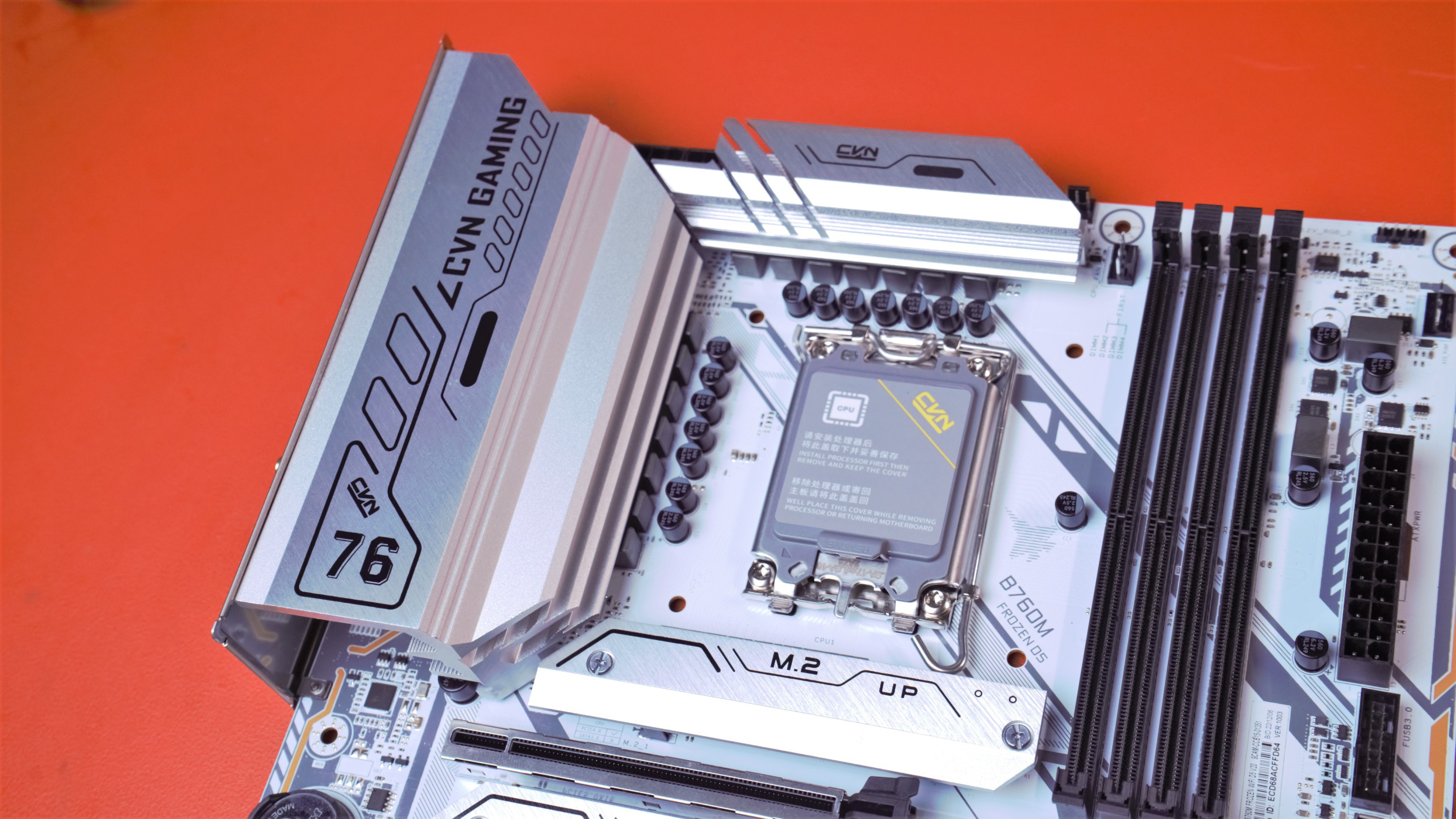 CVNB760M D5战列舰整体为白色在用料上非常的豪华,散热装甲覆盖到了供电芯片、南桥、以及Ml2,都有覆盖到位,可以说是非常豪华了