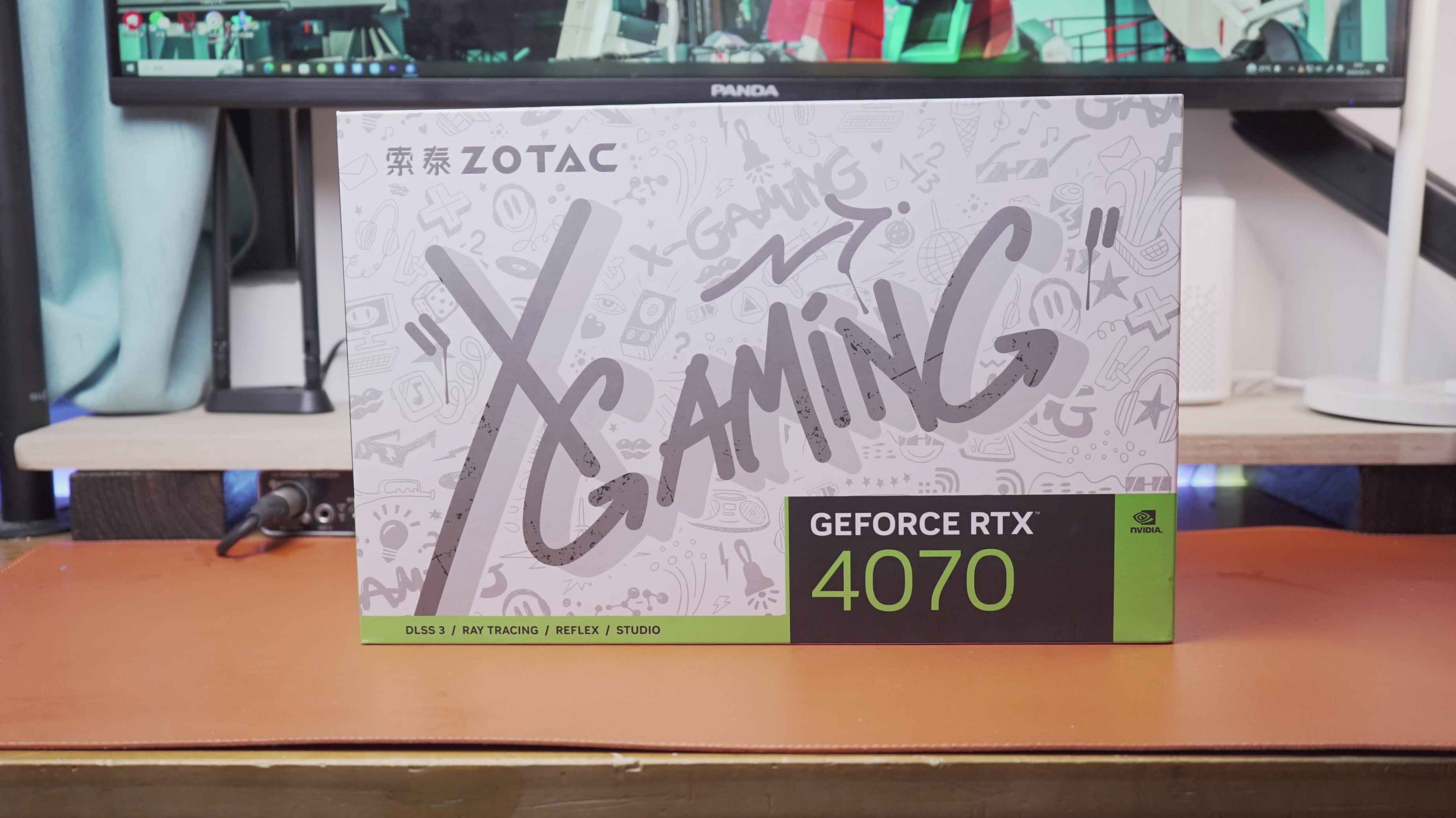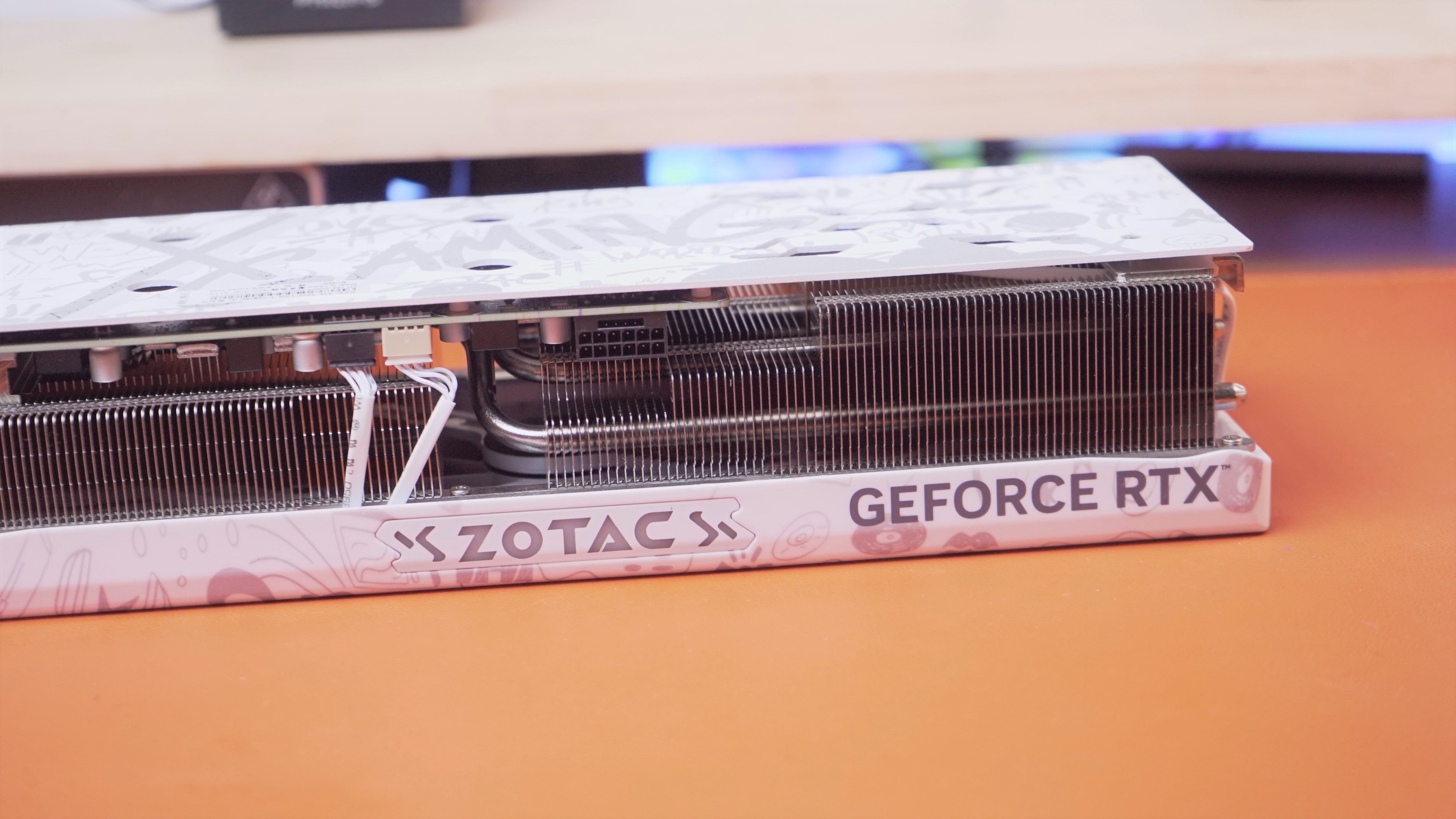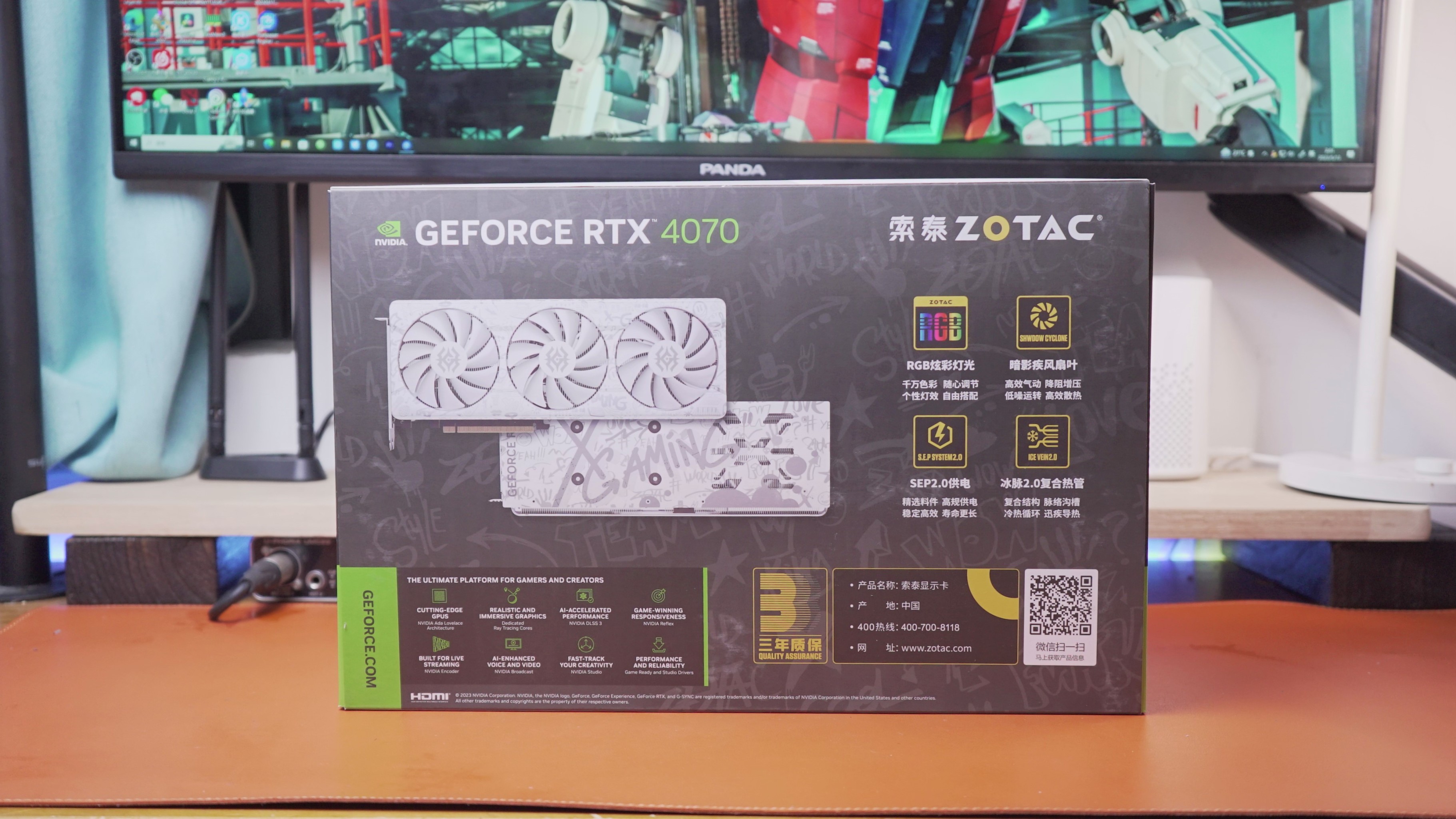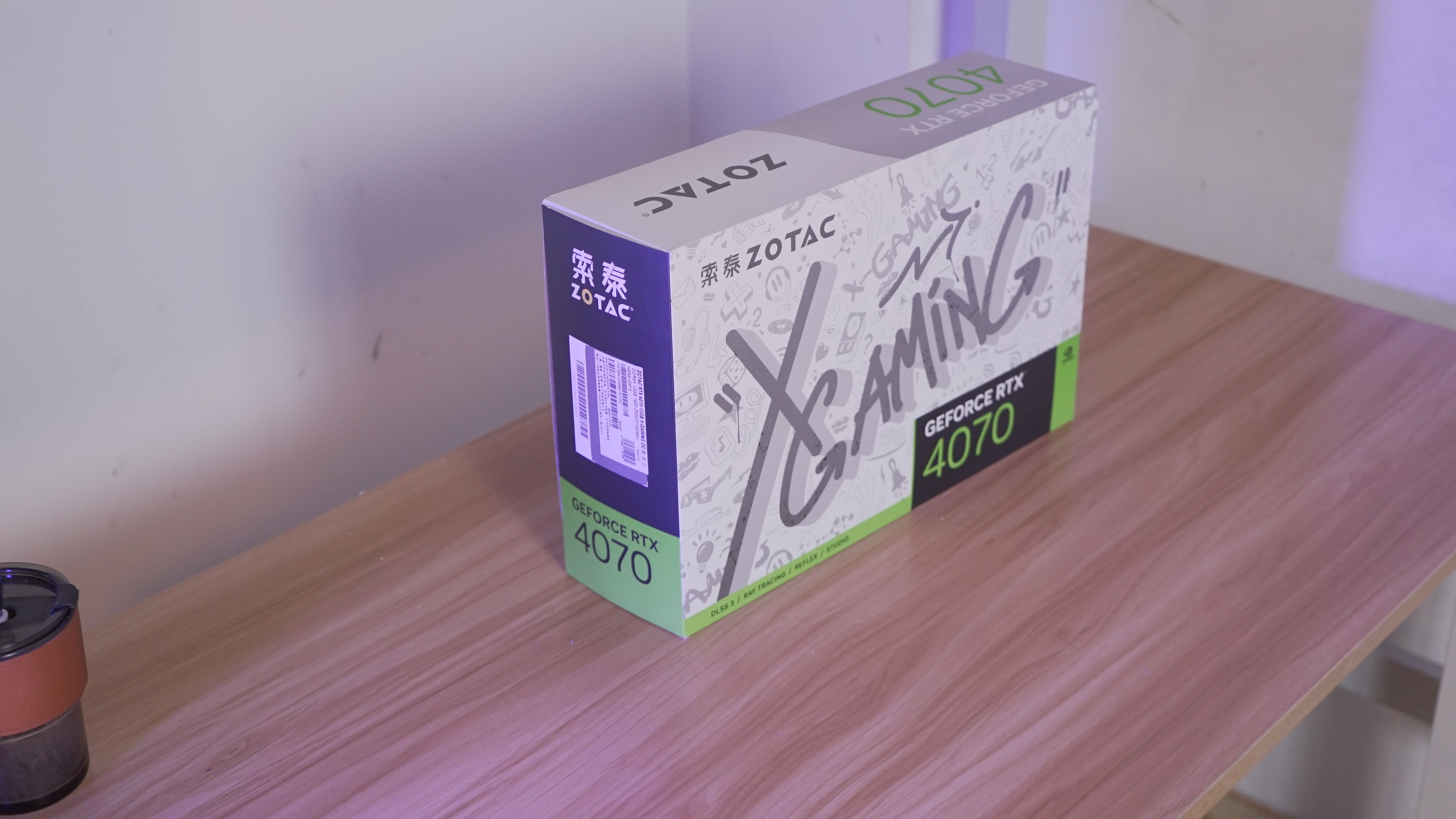 RTX 4070 X-GAMING OC欧泊白在侧面有索泰的ZOTAC LOGO信仰灯和英伟达的GEFORCE RTX LOGO