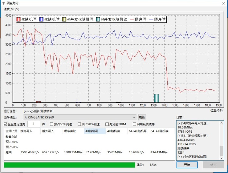缓外:KP2602B在320GB之内会保持满整,过了320GB之后全开始第一次编外速度会下降到1500aMB/S到2500.MB/S的速度,到了1.45的占后之后会第二次缓外速度会下降到657MB/S并到最后。