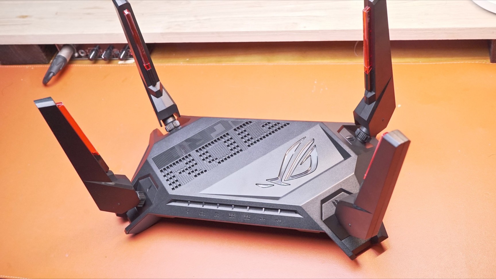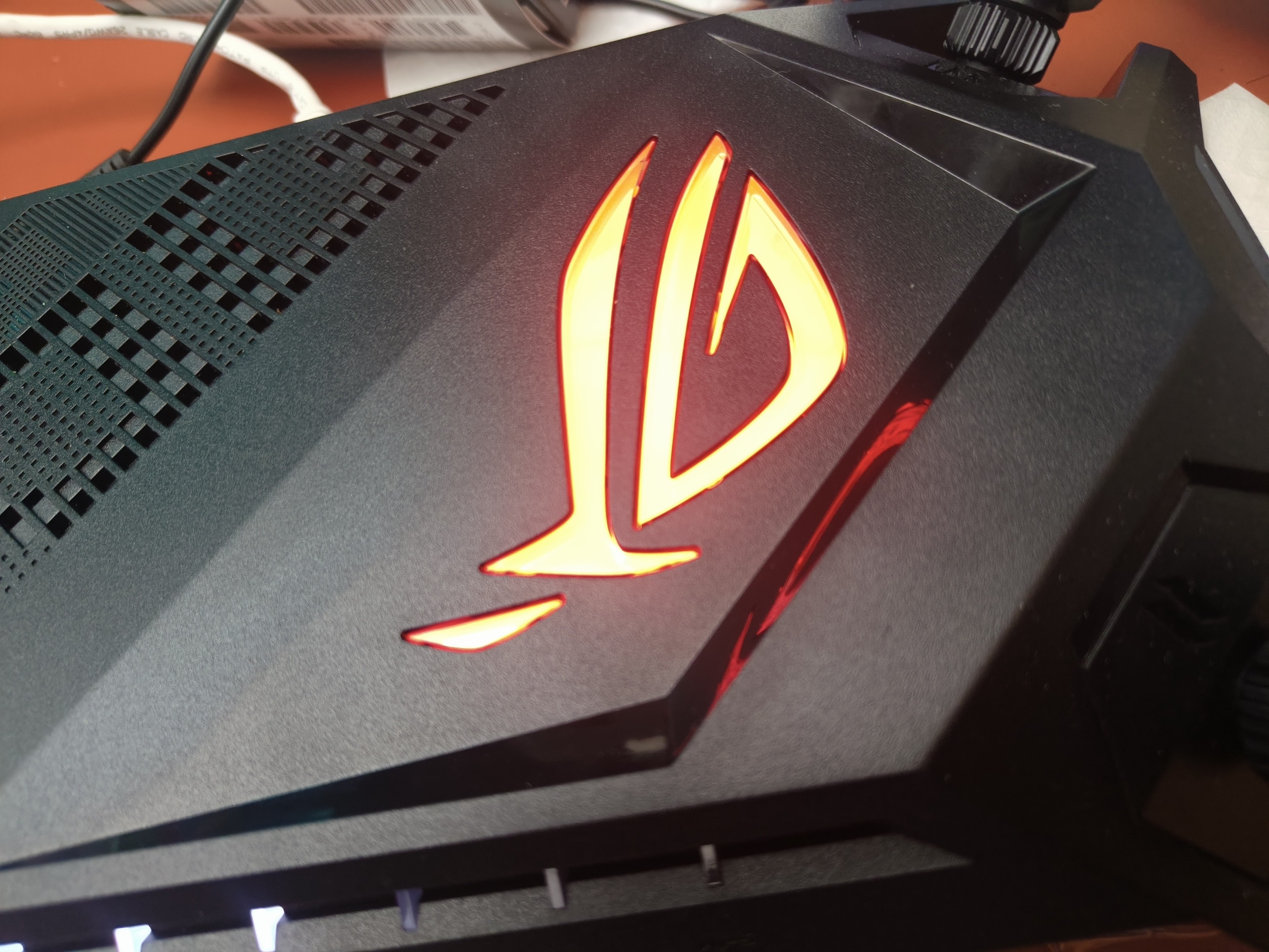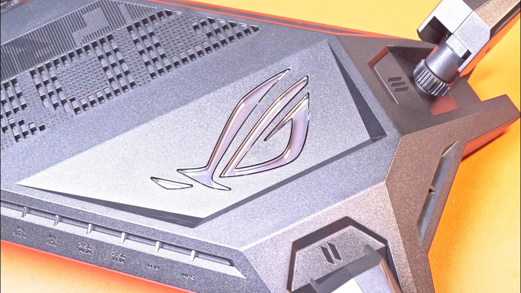 在路由器顶上有部分镂空进行散热同时也一定装饰作用,在旁边就是非常著名的败家之眼LOGO!这个logo你可以通过app来调节他的颜色