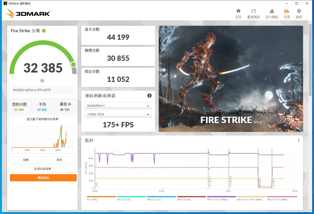 在测试DX11的Fire Strike测试中得到了:Fire Strike得分:32385分,显卡得分:44199分