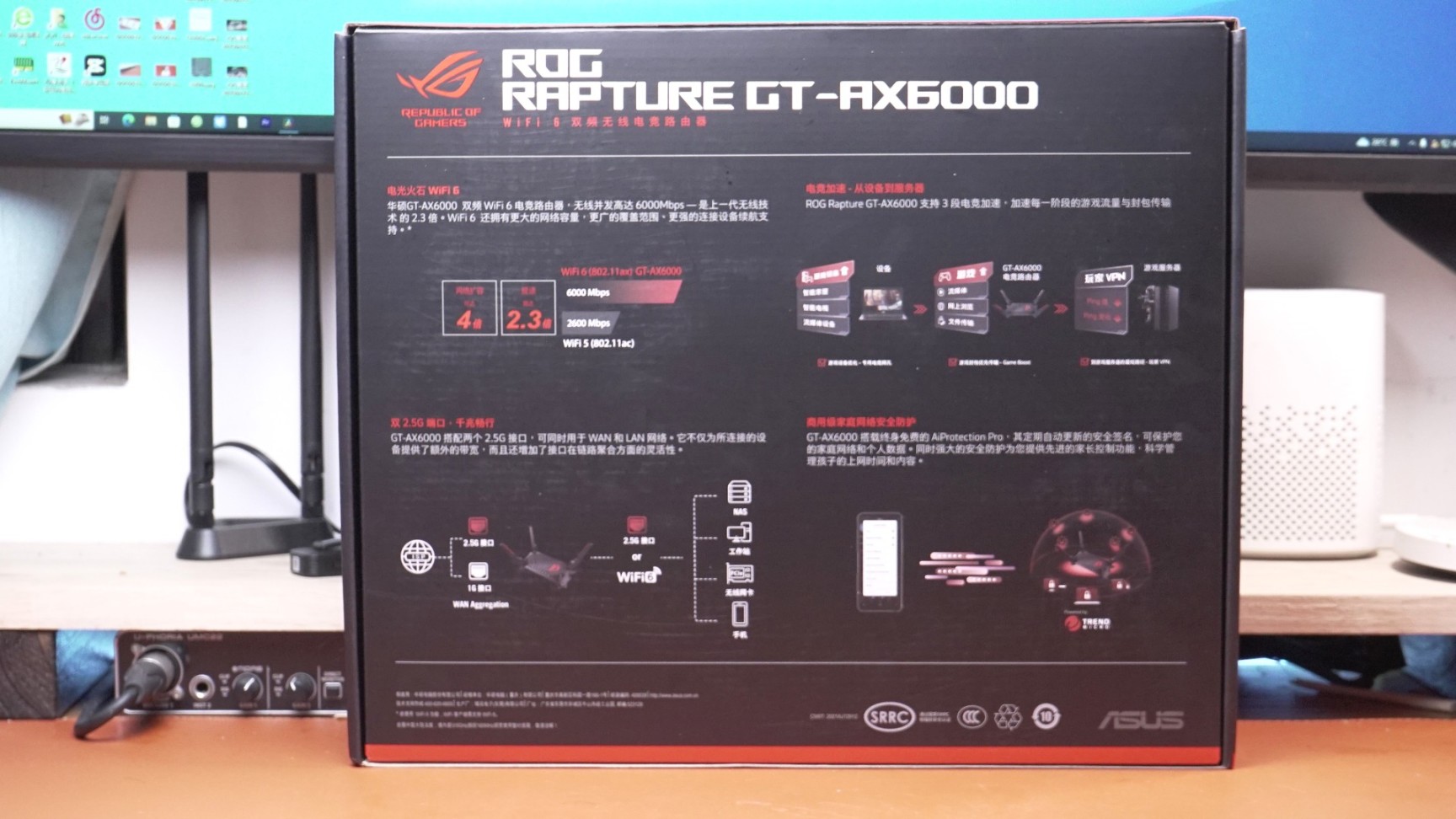 华硕GT AX6000包装非常的巨大!在中间有华硕ROG GT AX6000的图案,黑红的配色突显了他作为电竞路由器的定位,以及无处不在的败家之眼logo在包装侧面和背面有产品的规格信息和一些主要卖点。