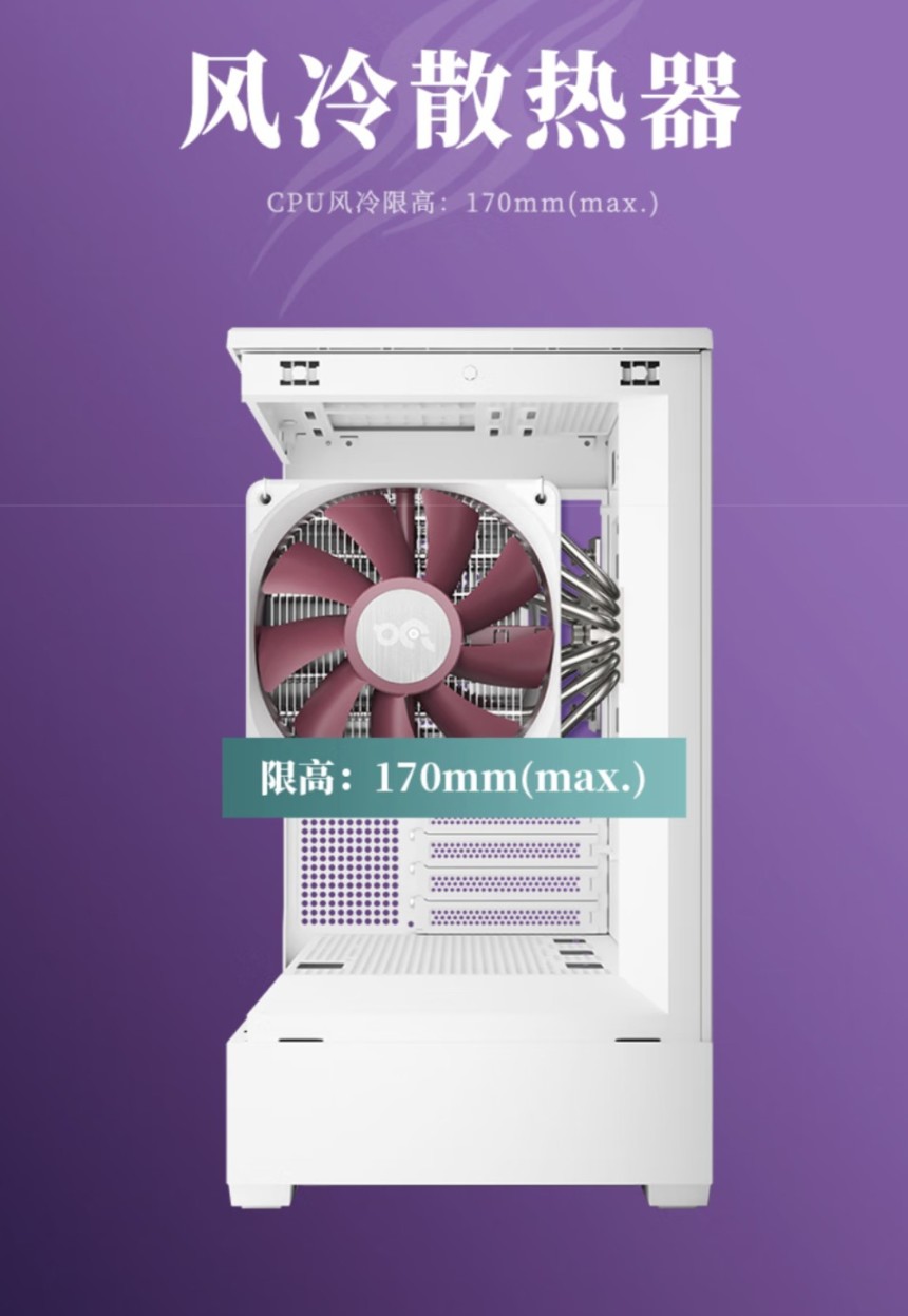 如果想安装风冷的情况下需要注意的是这个机箱的风冷限高的是170 mm的高度,你要选风冷的话就要按照这个限高之下来选购!不然会岀现盖不上盖板的清况,通常都会在评情业下有标注的,或者你直接问客服也可以!