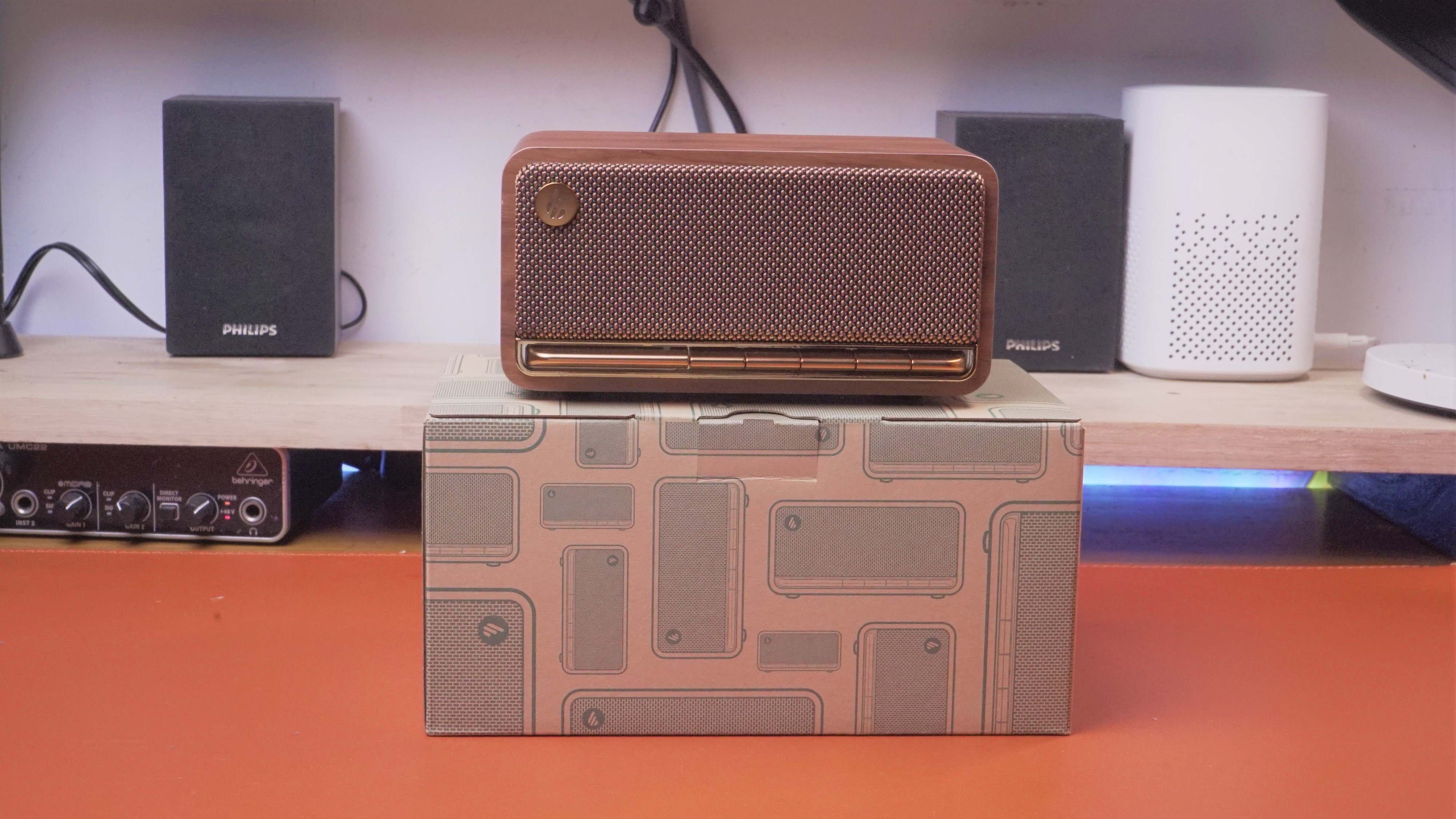 音响用的是漫步者的m230,是一个非常复古的蓝牙小音箱,买这个音响的原因,就是因为它的外观,我个人非常喜欢这种复古经典风格,