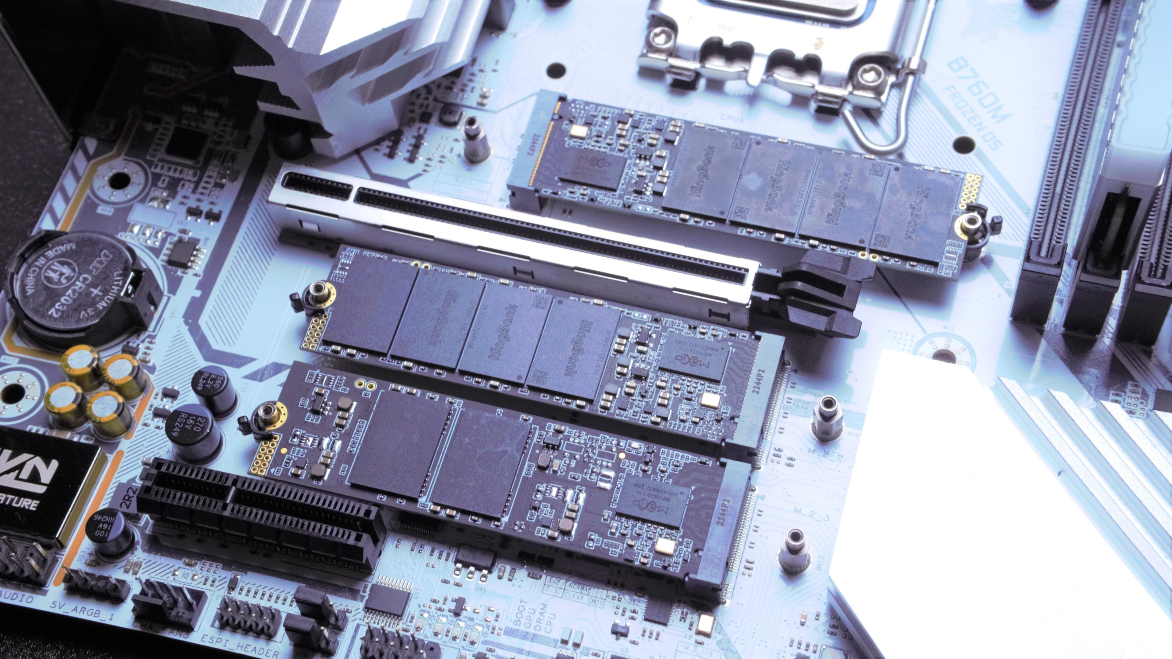 七彩虹CVNB760M D5战列舰提供了3条M.2插槽,其中两条有散热装甲覆盖,只有一条没有,并且都支持Pcie4.0