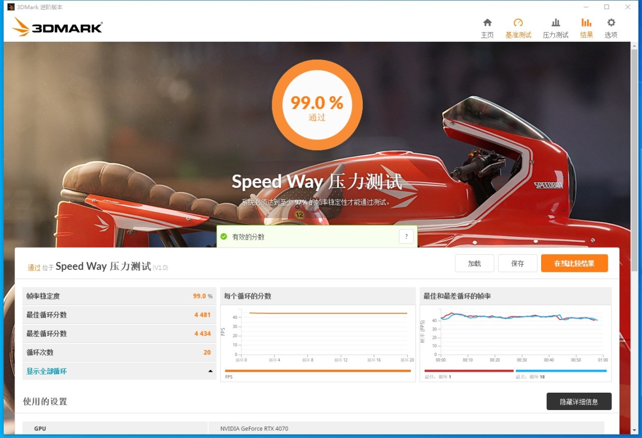 在3D Mark Speed Way压力测试中得到了99.0%通过了压力测试。