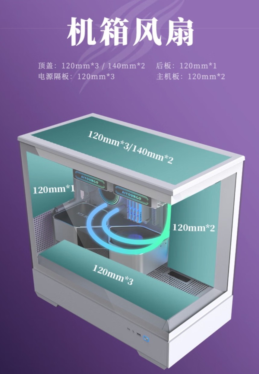 如果不安装水冷的情况下。这个机箱可以安装9把120的风扇!顶部和底部各支持支持三把120的风扇,侧面支持2把120风扇以及后岀风口支持1把120的风扇。