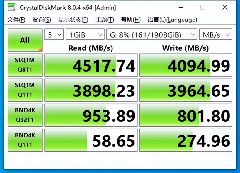 CrystalDiskMark跑分:写入:4517.74MB/S 读取:4094.81MB/S