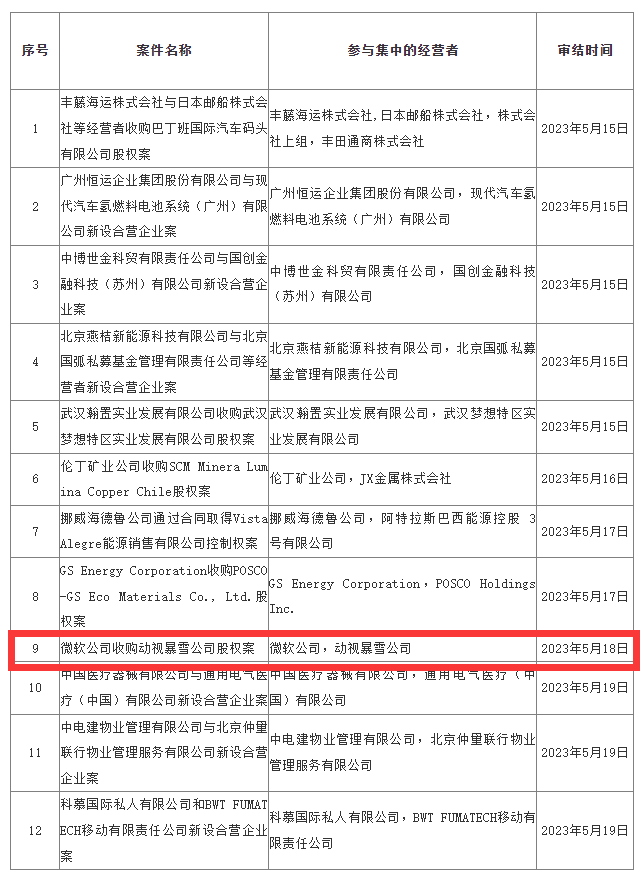 据国家市场监督管理总局公告文件,2023年5月15日—5月21日批准经营者集中案件列表显示,已于5月18日批准微软公司收购动视暴雪公司股权案。