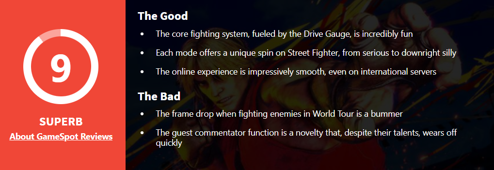 《街霸6》的戰鬥是系列歷史以來最靈活、多變、最具表現力的。遊戲模式與可操作角色多樣且精彩,適合每一個格鬥遊戲愛好者
