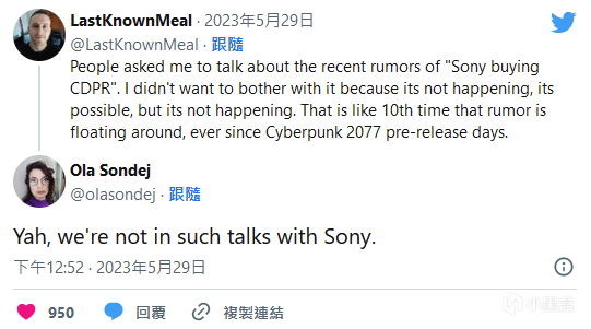 这一讨论在推特上引发的热度让CDPR的官方人员不得不亲自出面解释,CDPR 华沙工作室的公关代表 Ola Sondej 昨(29)日首度出声平息谣言,“我们没有与索尼进行此类谈判。”