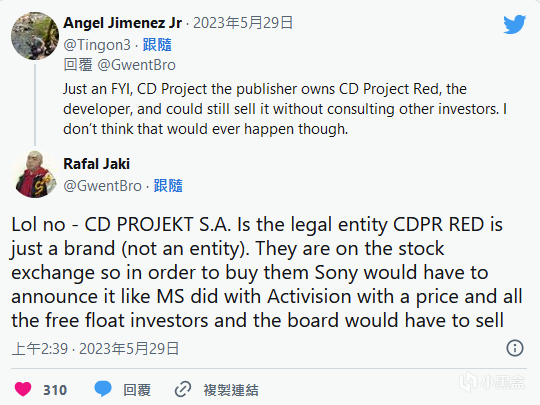 前《赛博朋克:边缘行者》执行制作人 Rafal Jaki 解释说,如果索尼正在就此事谈判,但由于公司结构庞大,很快就会成为公共消息,尤其是公开上市公司,股东们可能会有第一手消息。