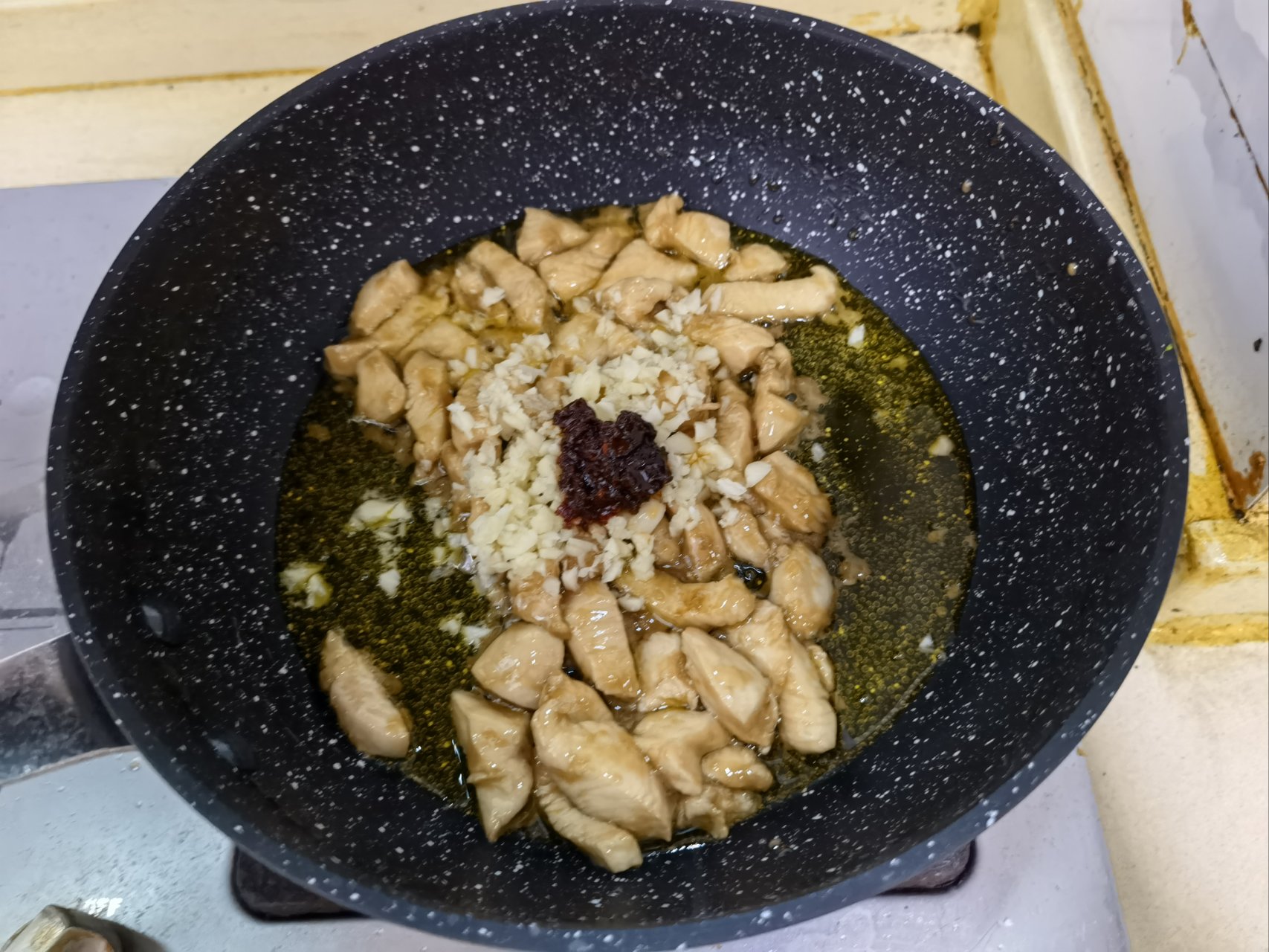 等油烧到四成热即下入鸡胸肉,煸炒至鸡胸肉血色刚消失时就下入蒜末和一勺豆瓣酱,翻炒匀调料,