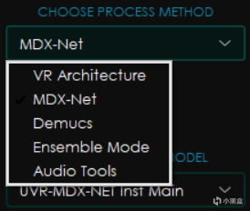 目前UVR的主要处理模型类别包括三种,即VR Architecture、MDX-Net、Demucs,而另外两个选项则分别是多模型组合模式和音频处理工具,这篇文章里暂时不做更多探讨。