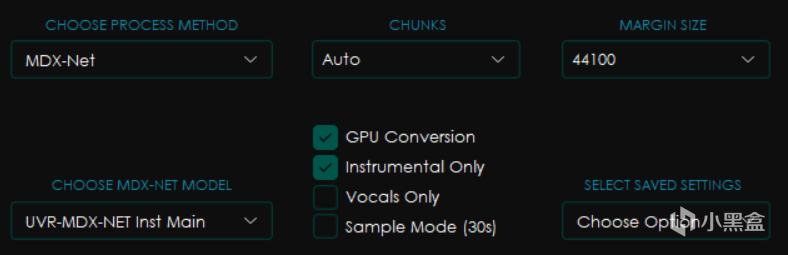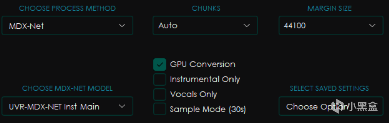 下面的点选框中分别是GPU Conversion使用显卡转换,Instrumental Only仅伴奏,Vocals Only仅人声和Sample Mode采样模式(就是只截取30秒)
