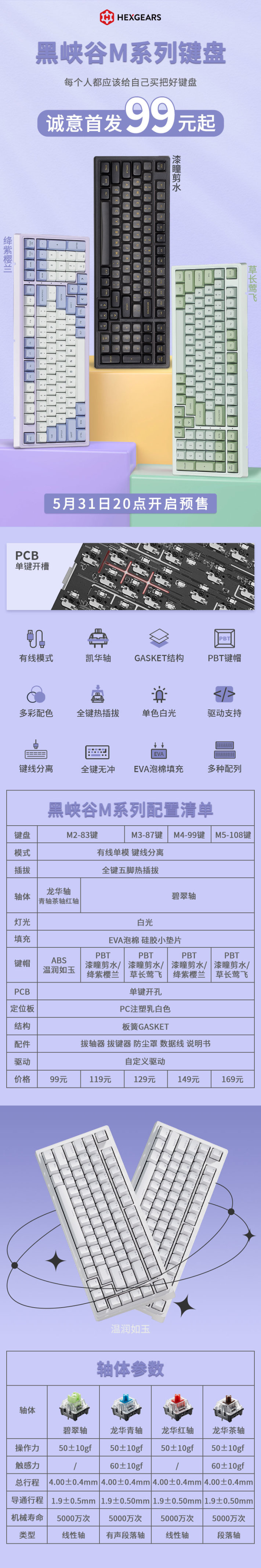 在寫稿的時候突然有人發了這個系列的圖,乍一看感覺還沒有上面的幾款性價比高,但定睛一看發現還是有競爭力的。不同於上面幾把的99“丐”版,M系列全系均標配了單鍵開槽,即使是99的版本也是帶有的哦,這一點來看就值得購買;其次是M4和M5,作爲這個價可能是唯一的大配列,雖然其他地方有些許不足之處也是當前最值的購買的98%以及104鍵配列。個人建議考慮M4以及M5。
