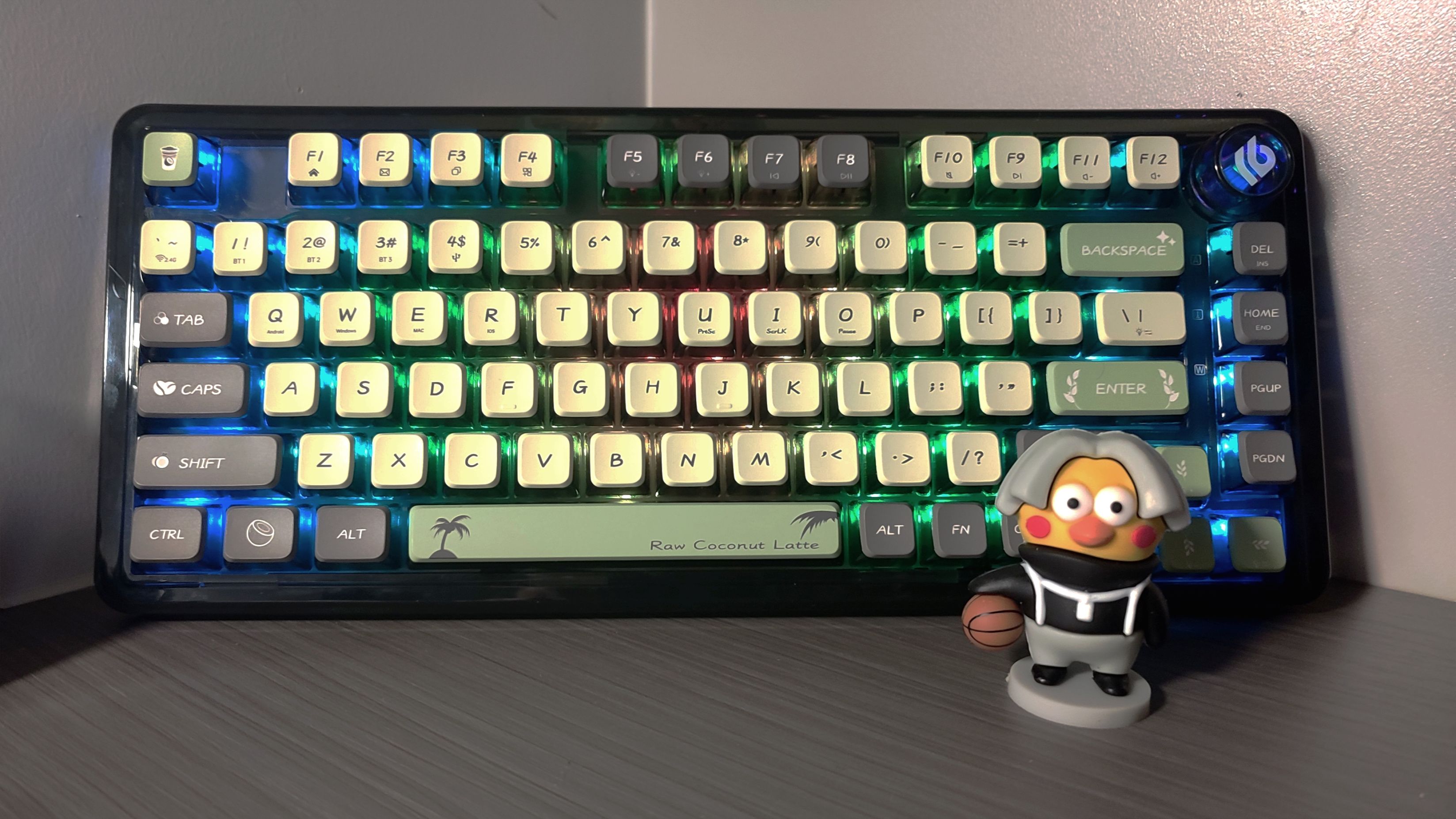 很少見的全透明鍵盤,並且素質相對不錯。同時多種配色可選,鍵帽也採用了雙皮奶結構的PBT+PC鍵帽,再透光的同時保證了耐用性。填充有硅膠以及PORON棉可選,可能唯一缺點就是外殼PC材質容易粘指紋以及劃傷。