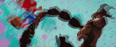 同时米尔戈热爱的颜色漂移、辅助线画法也同样沿用至今,角色依然会有清晰的描边,略微张乱的线条与多余颜色的溢出,在视觉上营造了一种模糊感,突出了视觉重心,场景依旧是色彩鲜艳、静态2.5D背景突出角色的高速移动。