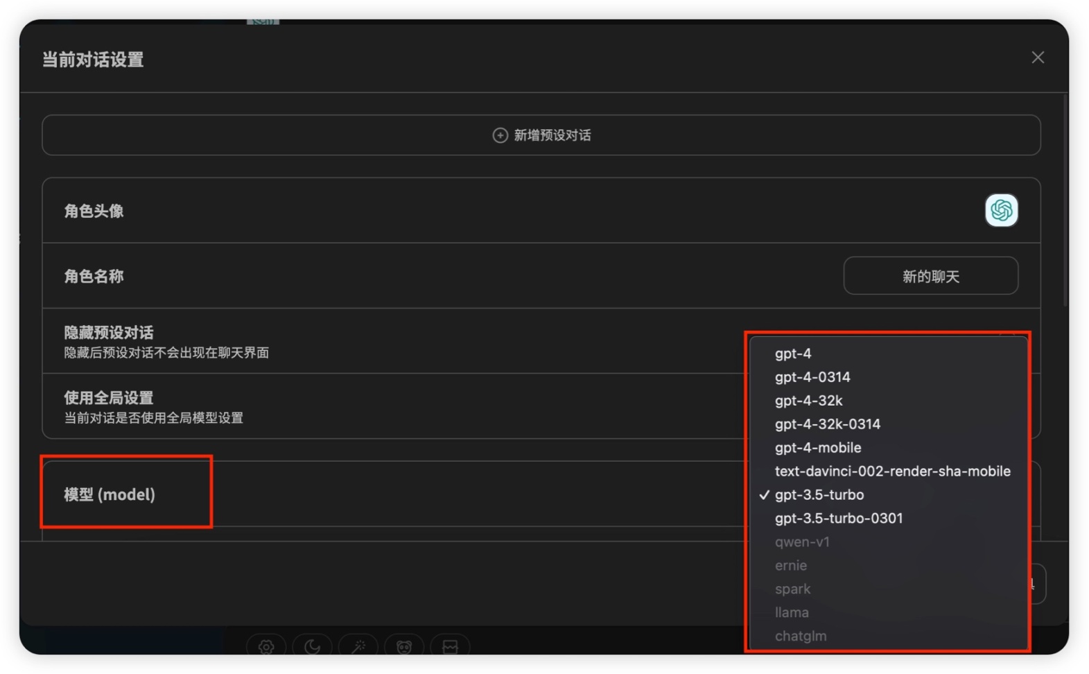 軟件已經支持許多模型,如前文所述,gpt-4-32k和gpt-4-32k-0314這兩個模型目前無法使用。如果要使用GPT-4模型,請選擇gpt-4或gpt-4-0314。此設置僅在當前對話中有效。在新建對話時,將再次使用軟件的默認模型gpt-3.5-turbo。