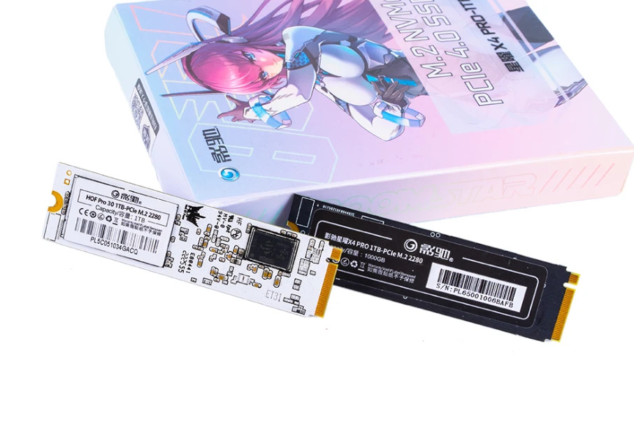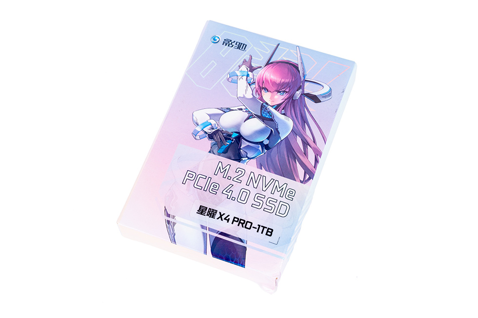 星曜X4 Pro 1TB定位PCIe4.0入門級固態硬盤,採用全綵的外觀包裝設計,外包裝正面爲喜聞樂見的機甲星曜娘,主打一個二次元風格,正面標註有具體的型號。