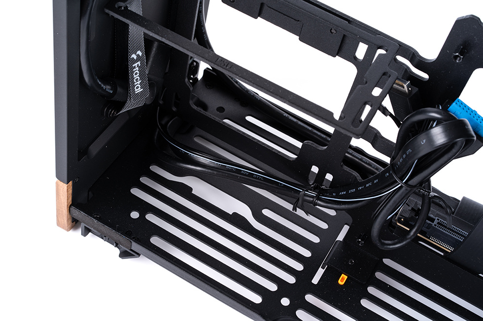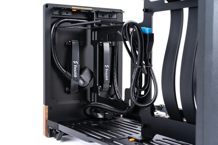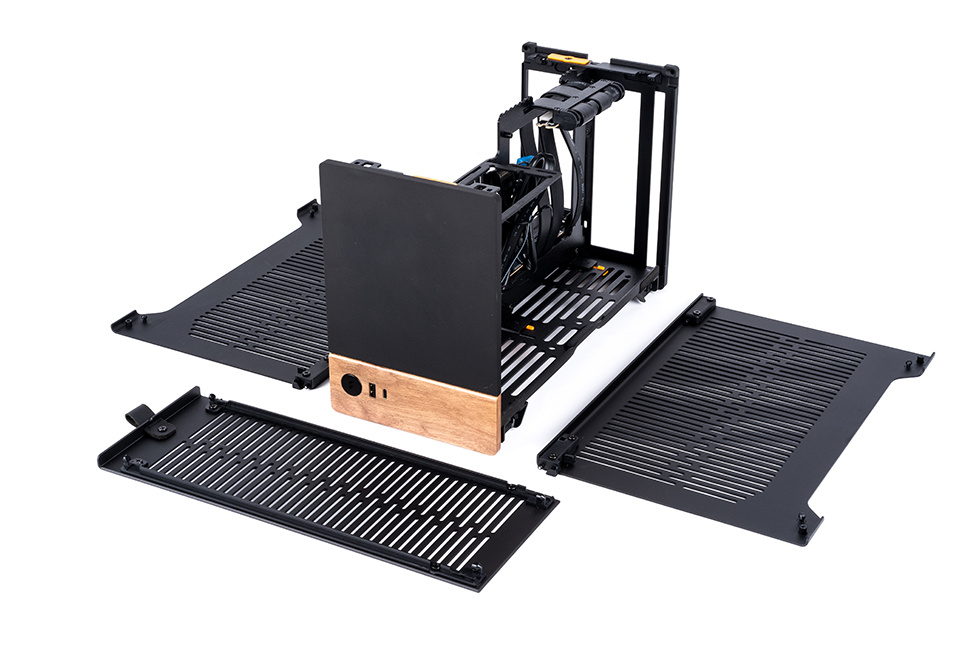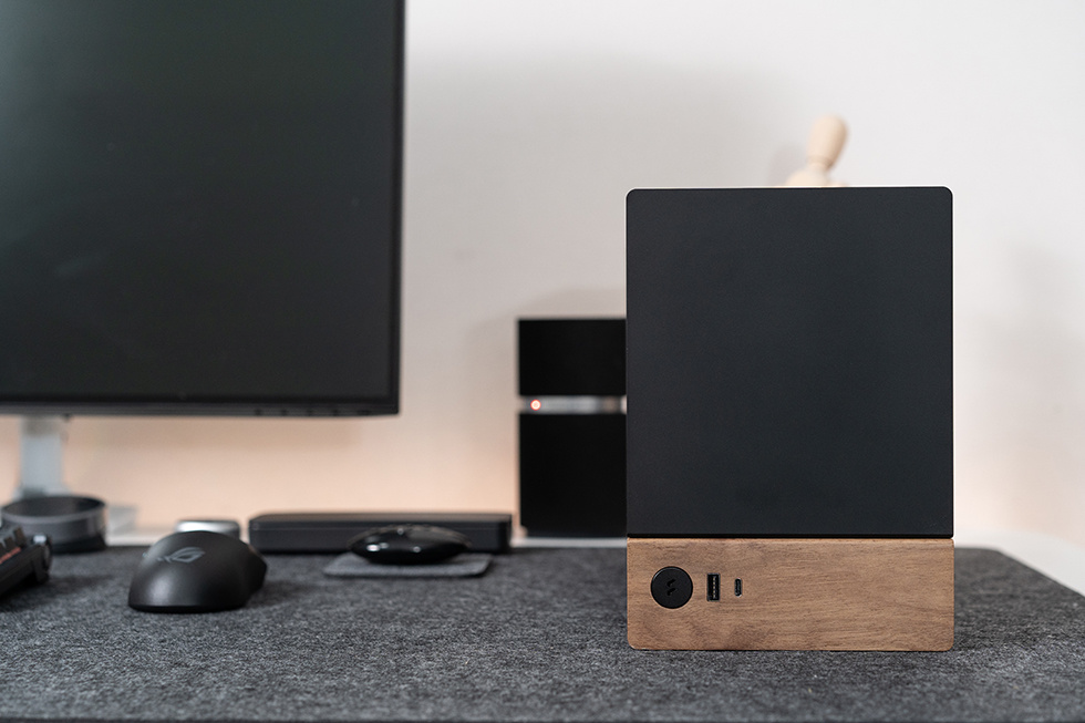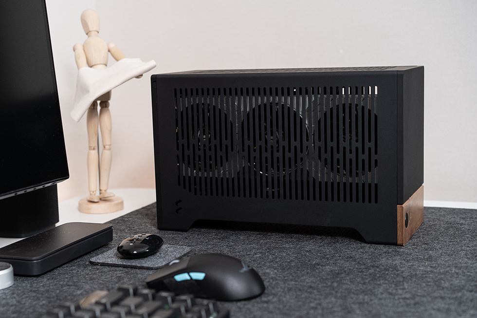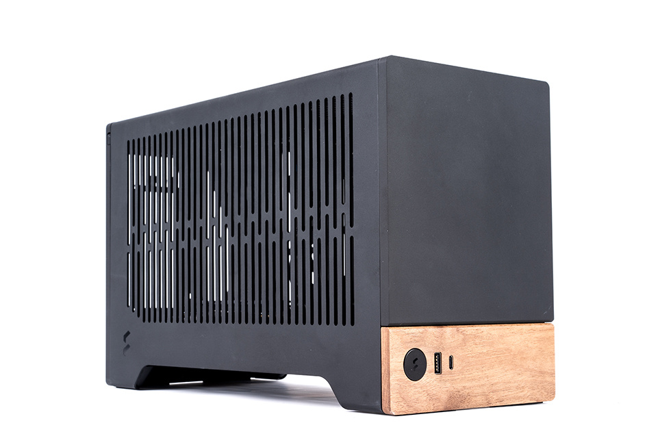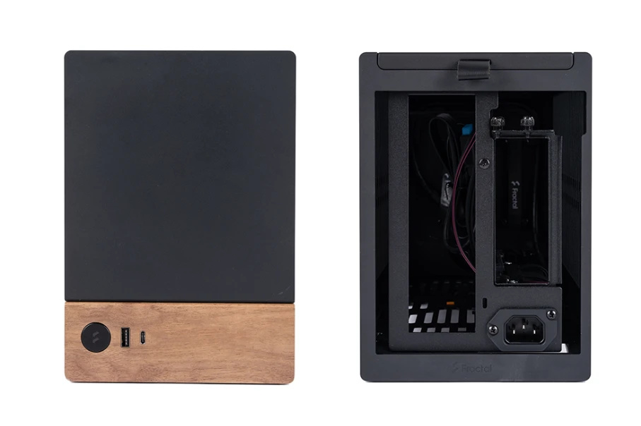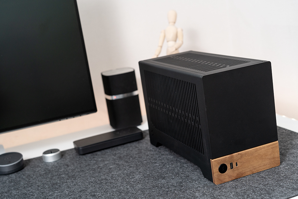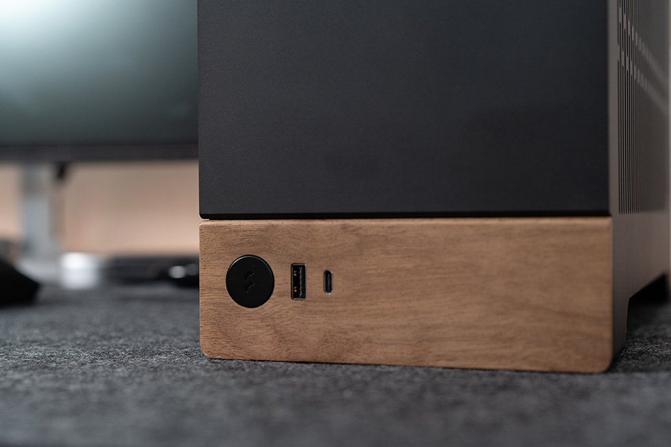 Terra 的正面非常有特色,延續了North的設計語言,加入實木元素。啞光黑和胡桃實木的撞色處理一下子讓整個機箱的調性雅緻起來。