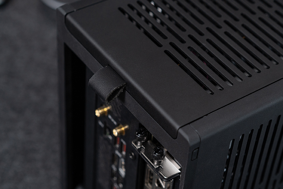 最後看一下開放性的尾部,電源尾插佈置在了下方,這樣就避免了一根粗粗的電源線翹起來的尷尬。頂部的面板尾端附有一個小的皮質拉手,輕輕一拉就可以完成拆卸。