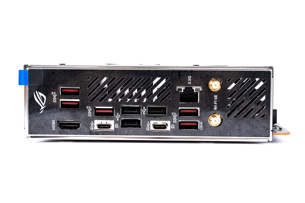ROG STRIX X670E-I GAMING WIF 主板 採用一體化的I/O面板,提供2個USB4、4個USB 3.2 Gen2 Type-A接口、3個USB 2.0、2個HDMI接口、Wi-Fi/Bluetooth天線接口(支持Wi-Fi 6E和藍牙5.2)、1個2.5Gb網卡接口。