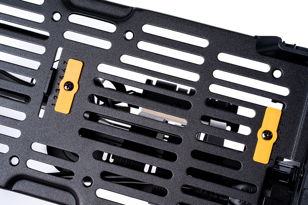 其中最顯眼的就是中間的橙色長方形螺絲墊片,在墊片的上方標有1,2,3,4,5,6,7四個刻度數字。Terra的中框支持左右移動調節,調節範圍爲30mm,從而適應不同的顯卡厚度及散熱器高度。最大支持77mm的風冷散熱及48mm厚度的顯卡。