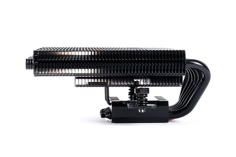 AXP120-X67 BLACK ARGB整體安裝高度爲67mm,搭配120mm的15mm薄扇,相對於普通版的AXP120-X67,其機身和扣具做了黑化處理,散熱風扇帶ARGB燈效。