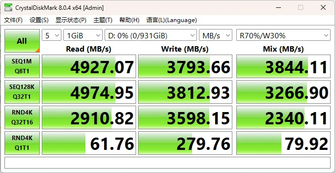 星曜X4 Pro 1TB爲標準2280規格,黑色單面PCB設計,官方標稱連續讀取速度爲5000 MB/s,連續寫入速度爲3500 MB/s,寫入壽命上限爲250TBW,整體性能作爲從盤來講足夠了。