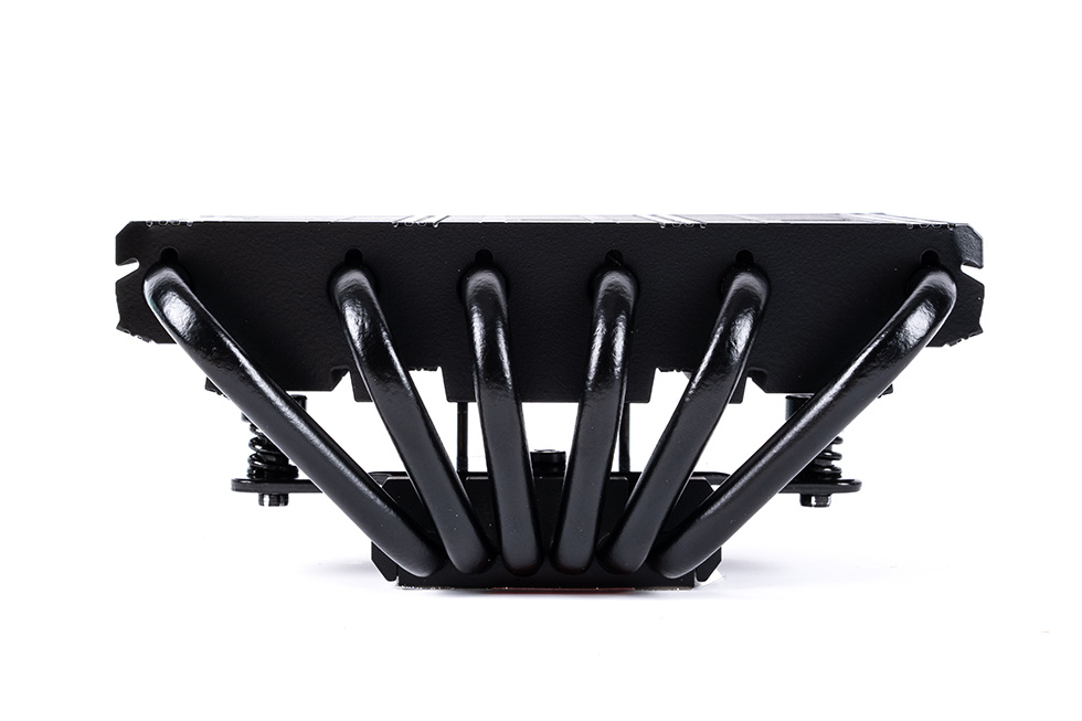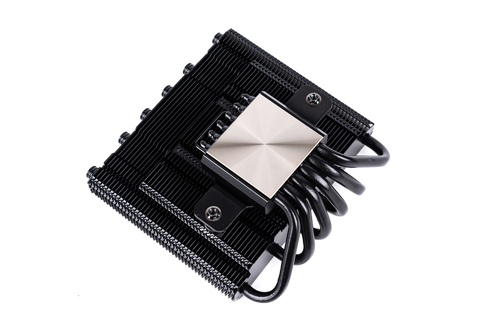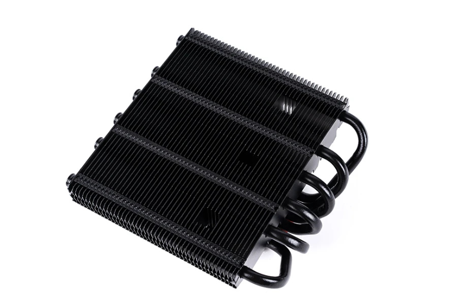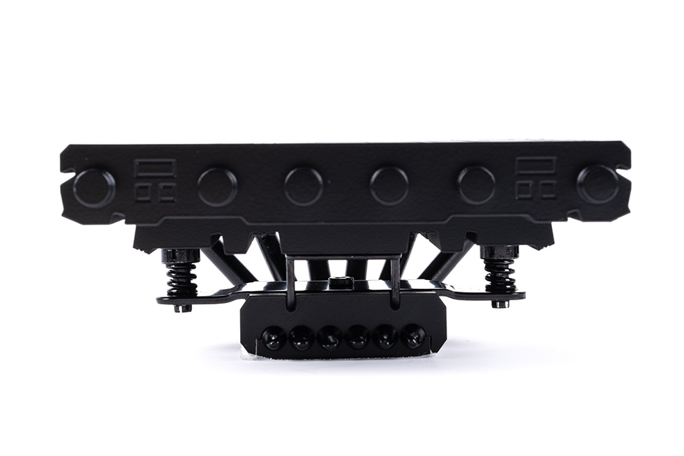 AXP120-X67 BLACK ARGB基座在不安裝風扇的情況下高度爲52mm,整體採用納米噴漆工藝,在熱管設計上,採用了6根AGHP Gen3迴流焊。與100RH不同的是在熱管頂端的裝飾帽上沒有LOGO鋼印,換成了與風扇同色的塗裝。