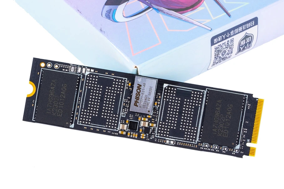 揭掉貼之後可以看到,PCB上由一顆羣聯PHISON PS5021-E21T主控和兩顆自封的3D NAND閃存組成。羣聯PHISON PS5021-E21T主控,採用Cortex-R5處理器和TSMC 12nm工藝打造,基於PCIe 4.0x4規格和NVMe1.4協議,支持第四代LDPC ECC技術,擁有四條NAND通道可支持TLC和QLC顆粒。